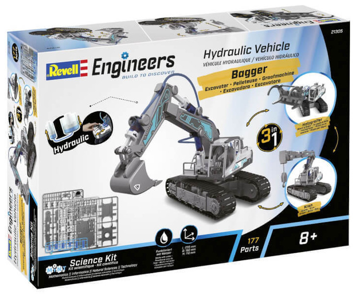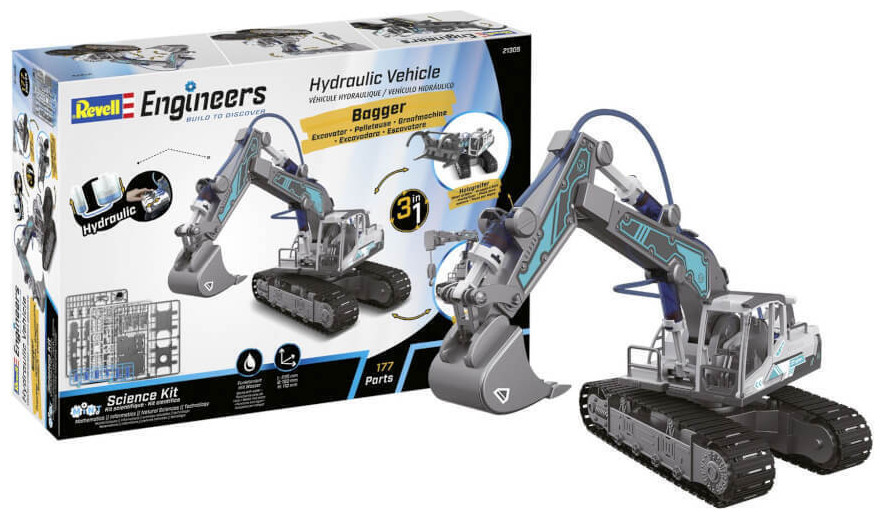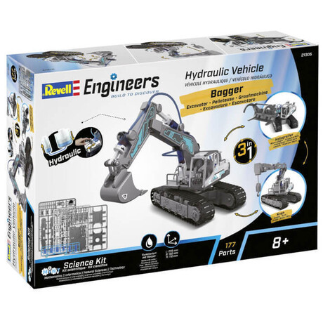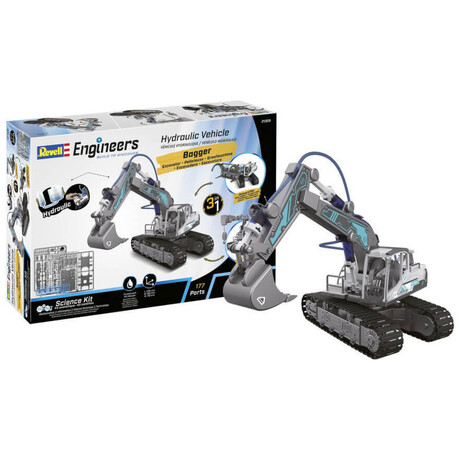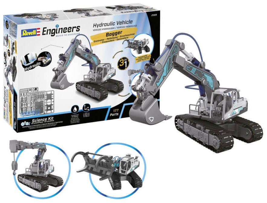 Με τον Hydraulic Excavator 3in1 της Revell Engineers, τα παιδιά από 8 ετών μπορούν να ανακαλύψουν τον κόσμο της τεχνολογίας με παιχνιδιάρικο τρόπο! Ο υδραυλικά ελεγχόμενος βραχίονας και η μηχανική κίνηση αλυσίδας παρέχουν μια ρεαλιστική εμπειρία και αρχικές γνώσεις σχετικά με τη λειτουργία των υδραυλικών συστημάτων. Είτε ως εκσκαφέας, είτε ως γερανός είτε ως φορτωτής ξυλείας, το μοντέλο μπορεί να μετατραπεί εύκολα, προσφέροντας ποικίλες διασκεδαστικές και συναρπαστικές εμπειρίες εκμάθησης.