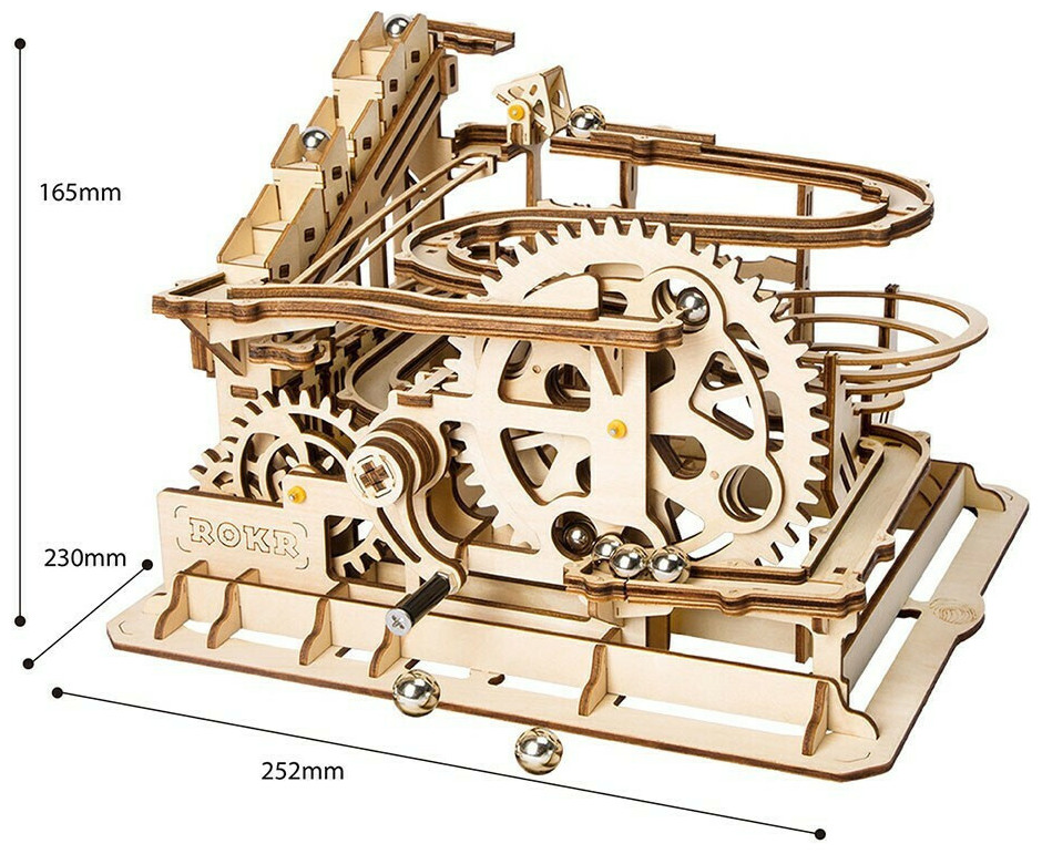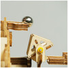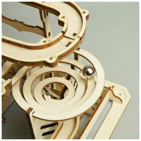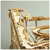 Δημιουργικό 3D ξύλινο puzzle με ανυψωτήρα, γρανάζια και τροχούς και μπίλιες που τρέχουν στις τσουλήθρες.