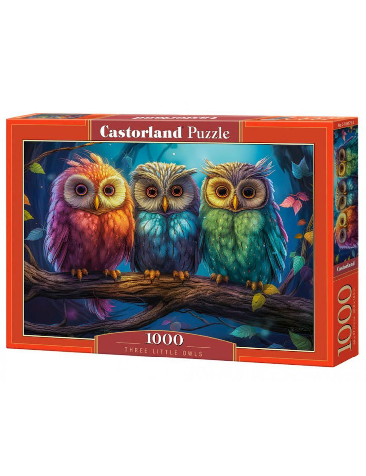 Το Castorland 105175 Puzzle 1000 τεμ. – Three Little Owls είναι ένα καλλιτεχνικό παζλ υψηλής ποιότητας, που απεικονίζει τρεις μικρές κουκουβάγιες σε μια ατμοσφαιρική, πολύχρωμη σύνθεση, προσφέροντας μια ευχάριστη και λεπτομερή εικόνα για συναρμολόγηση.