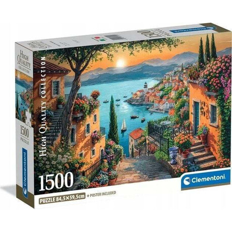 Το Clementoni 31729 Puzzle 1500 τεμ. – Steps To Harbor (with poster) είναι ένα καλλιτεχνικό παζλ υψηλής αισθητικής, που απεικονίζει μια γαλήνια μα και ατμοσφαιρική σκηνή με σκαλιά που οδηγούν προς το λιμάνι, αποδίδοντας με ρεαλισμό τα χρώματα, το φως και την παραδοσιακή ομορφιά του τοπίου.