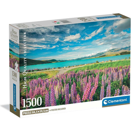 Το παζλ Clementoni 31731 Lupins at Lake Tekapo 1500 τεμαχίων παρουσιάζει ένα μαγευτικό φυσικό τοπίο με πολύχρωμα λούπινα να ανθίζουν στην όχθη της λίμνης Lake Tekapo, υπό το φως του ουρανού και με τις εντυπωσιακές αντανακλάσεις στο νερό. Η εικόνα αναδεικνύει την αρμονία των χρωμάτων, τη γαλήνη του περιβάλλοντος και τις λεπτομέρειες της φύσης, προσφέροντας μια απολαυστική και καθηλωτική εμπειρία συναρμολόγησης.