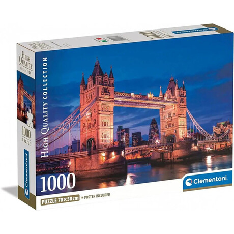 Το Clementoni 39772 Puzzle 1000 τεμ. – Compact Tower Bridge London αποτελεί ένα καλλιτεχνικό παζλ υψηλής αισθητικής που απεικονίζει την εμβληματική γέφυρα Tower Bridge στο Λονδίνο, αποδίδοντας με ρεαλισμό τα κτήρια, τα νερά του ποταμού Τάμεση και τη μοναδική αρχιτεκτονική της πόλης.