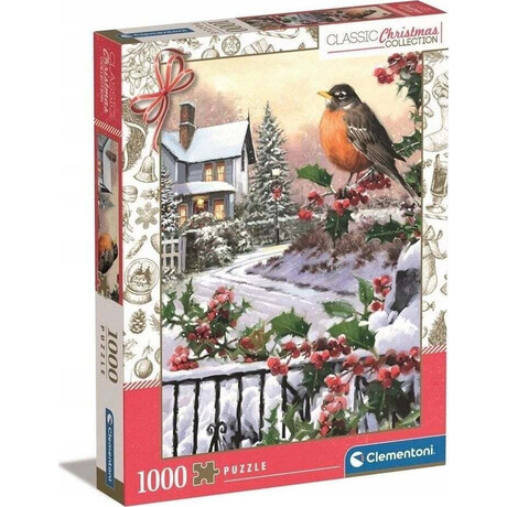 Το Clementoni 81501 Puzzle 1000 τεμ. – Robin And Holly Bushes αποτελεί ένα καλλιτεχνικό παζλ υψηλής ποιότητας, που αναπαριστά με ρεαλισμό ένα γιορτινό φυσικό τοπίο με έναν κόκκινο σπουργίτη (robin) ανάμεσα σε πυκνά χριστουγεννιάτικα κλαδιά και φύλλα αγιοκλήματος (holly). Το παζλ αποδίδει με λεπτομέρεια τα ζεστά χρώματα και τη γιορτινή ατμόσφαιρα της σκηνής, δημιουργώντας μια αίσθηση θαλπωρής και ηρεμίας.