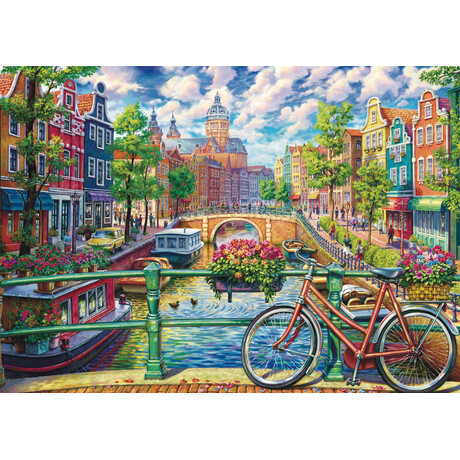 Το Schmidt 58877 Puzzle – Amsterdam Canal Magic είναι ένα παζλ 1000 κομματιών που απεικονίζει μια γραφική σκηνή από τα κανάλια του Άμστερνταμ. Η εικόνα παρουσιάζει μια γέφυρα πάνω από το κανάλι, με ποδήλατο ακουμπισμένο σε πράσινο κιγκλίδωμα, ενώ στο βάθος διακρίνονται πολύχρωμα κτίρια και ένα εντυπωσιακό αρχιτεκτονικό στοιχείο με θόλο.