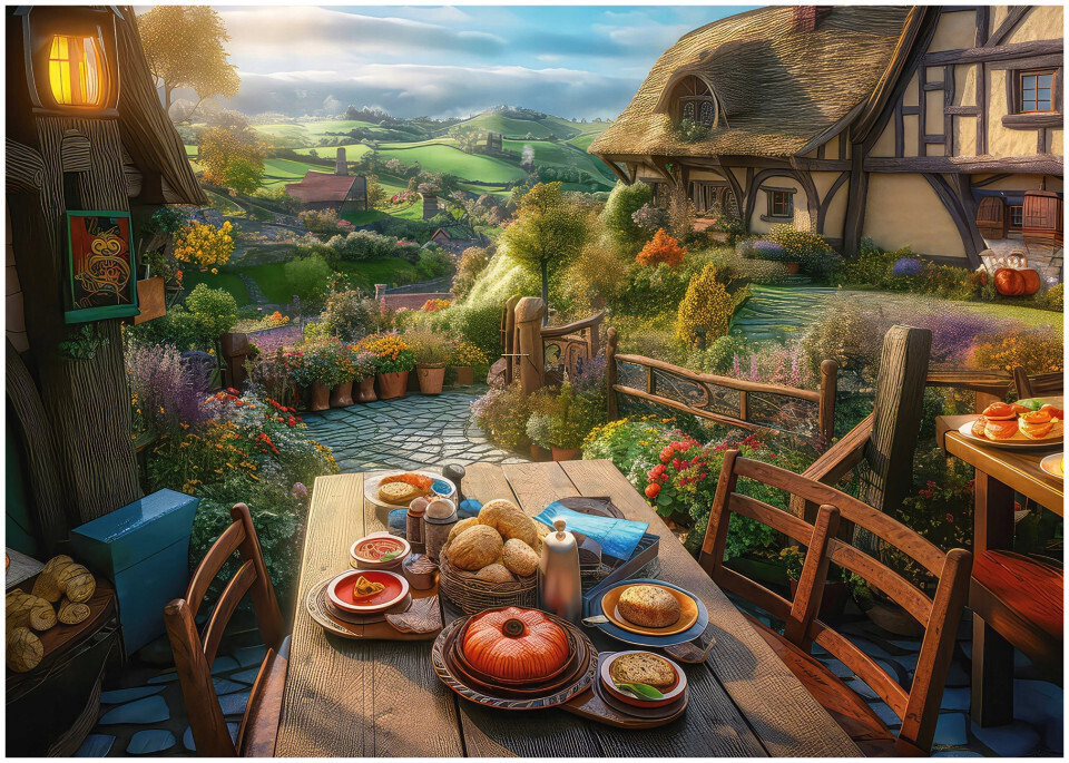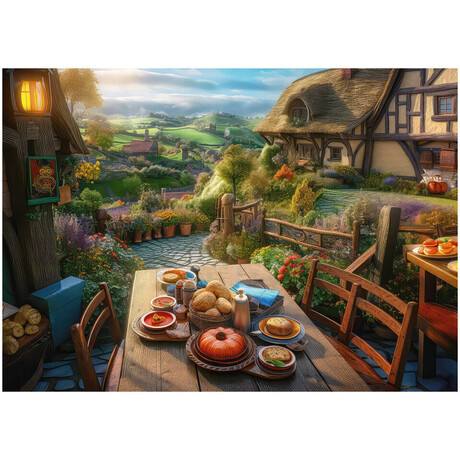 Το παζλ Schmidt 59763 Breakfast with a View 1000 τεμαχίων απεικονίζει μια ειδυλλιακή σκηνή με πρωινό σε βεράντα που αγναντεύει ένα μαγευτικό τοπίο, συνδυάζοντας ζεστά χρώματα, φυσικό φως και πλούσια λεπτομέρεια. Η σύνθεση δημιουργεί αίσθηση χαλάρωσης και ταξιδιωτικής διάθεσης, προσφέροντας μια ισορροπημένη πρόκληση συναρμολόγησης που αναδεικνύει τόσο τα στοιχεία του προσκηνίου όσο και το εκτεταμένο φόντο.