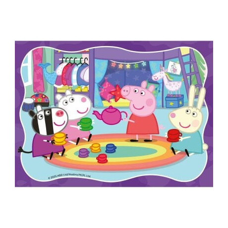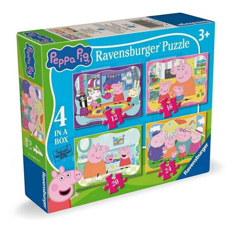 Το σετ Ravensburger 04104 Peppa Pig περιλαμβάνει τέσσερα (4) παζλ με διαφορετικό αριθμό κομματιών — 12, 16, 20 και 24 τεμάχια — όλα με θέμα την αγαπημένη παιδική σειρά Peppa Pig. Κάθε εικόνα απεικονίζει χαρούμενες, πολύχρωμες σκηνές με την Peppa και τους φίλους της, σχεδιασμένες για να προσελκύσουν το ενδιαφέρον των μικρών παιδιών και να ενισχύσουν τη δημιουργικότητα και τη συγκέντρωση μέσα από το παιχνίδι.