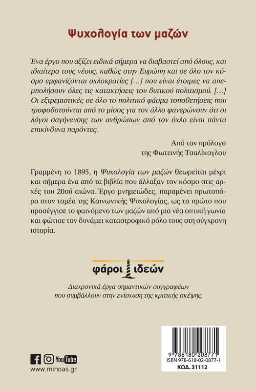 Ένα έργο που αξίζει ειδικά σήμερα να διαβαστεί από όλους, και ιδιαίτερα τους νέους, καθώς στην Ευρώπη και σε όλο τον κόσμο εμφανίζονται οχλοκρατίες […] που είναι έτοιμες να απεμπολήσουν όλες τις κατακτήσεις του δυτικού πολιτισμού. […] Οι εξτρεμιστικές σε όλο το πολιτικό φάσμα τοποθετήσεις που τροφοδοτούνται από το μίσος για τον άλλο φανερώνουν ότι οι λόγοι σαγήνευσης των ανθρώπων από τον όχλο είναι πάντα επικίνδυνα παρόντες. Από τον πρόλογο της Φωτεινής Τσαλίκογλου Γραμμένη το 1895, η Ψυχολογία των μαζών θεωρείται μέχρι και σήμερα ένα από τα βιβλία που άλλαξαν τον κόσμο στις αρχές του 20ού αιώνα. Έργο μνημειώδες, παραμένει πρωτοπόρο στον τομέα της Κοινωνικής Ψυχολογίας, ως το πρώτο που προσέγγισε το φαινόμενο των μαζών από μια νέα οπτική γωνία και φώτισε τον δυνάμει καταστροφικό ρόλο τους στη σύγχρονη ιστορία.