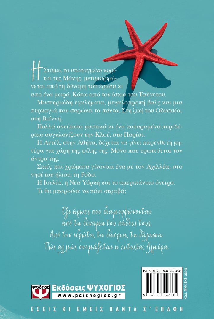 Η Στάμω, το υποταγμένο κορίτσι της Μάνης, μεταμορφώνεται από τη δύναμη του έρωτα κι από ένα μωρό. Κάτω από τον ίσκιο του Ταΰγετου. Μυστηριώδη εγκλήματα, μεγαλοπρεπή βαλς και μια πυρκαγιά που σαρώνει τα πάντα. Στη ζωή του Οδυσσέα, στη Βιέννη. Πολλά ανείπωτα μυστικά κι ένα καταραμένο περιδέραιο συγκλονίζουν την Κλοέ, στο Παρίσι. Η Αντέλ, στην Αθήνα, δέχεται να γίνει παρένθετη μητέρα για χάρη της φίλης της. Μόνο που ερωτεύεται τον άντρα της. Σκιές και χρώματα γίνονται ένα με τον Αχιλλέα, στο νησί του ήλιου, τη Ρόδο. Η Ιουλία, η Νέα Υόρκη και το αμερικάνικο όνειρο. Τι θα μπορούσε να πάει στραβά; Έξι ήρωες που διαμορφώνονται από τη δύναμη του πάθους τους. Από τον ιδρώτα, τα δάκρυα, τη θάλασσα. Πώς αλλιώς ονομάζεται η ευτυχία; Αλμύρα.
