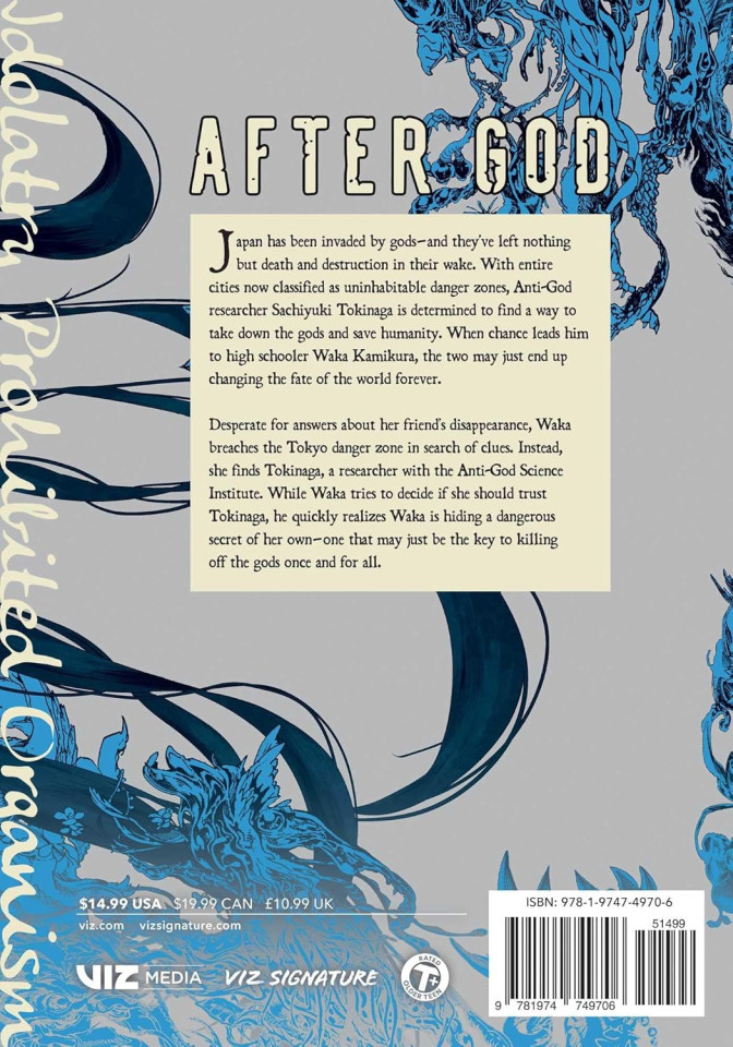 Το Viz Media After God, Vol. 1 παρουσιάζει την αρχή της καθηλωτικής σειράς After God, όπου οι χαρακτήρες αντιμετωπίζουν τις συνέπειες των θεϊκών δυνάμεων σε έναν κόσμο γεμάτο μυστήριο, δράση και ψυχολογικό βάθος. Ο τόμος συνδυάζει έντονη δράση, υπερφυσικά στοιχεία και ατμοσφαιρική αφήγηση, ενώ η λεπτομερής και χαρακτηριστική εικονογράφηση δημιουργεί μια συναρπαστική εμπειρία ανάγνωσης για fans του horror/action manga.