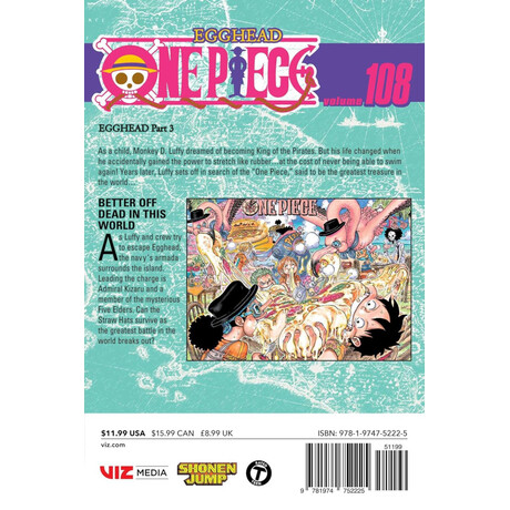 Το One Piece Vol. 108 συνεχίζει τις επικές περιπέτειες του Monkey D. Luffy και της ομάδας του, καθώς αντιμετωπίζουν νέους ισχυρούς αντιπάλους και ανακαλύπτουν μυστικά στον κόσμο του One Piece. Με δράση, χιούμορ και συναρπαστικές ανατροπές, κάθε σελίδα κρατά τον αναγνώστη καθηλωμένο και ενθουσιασμένο για την επόμενη περιπέτεια.