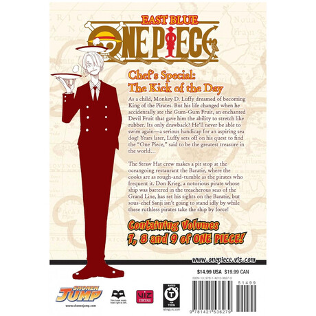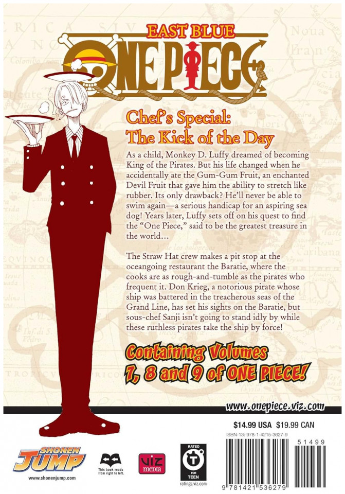 As a child, Monkey D. Luffy dreamed of becoming King of the Pirates. But his life changed when he accidentally ate the Gum-Gum Fruit, an enchanted Devil Fruit that gave him the ability to stretch like rubber. Its only drawback? He’ll never be able to swim again—a serious handicap for an aspiring sea dog! Years later, Luffy sets off on his quest to find the “One Piece,” said to be the greatest treasure in the world…