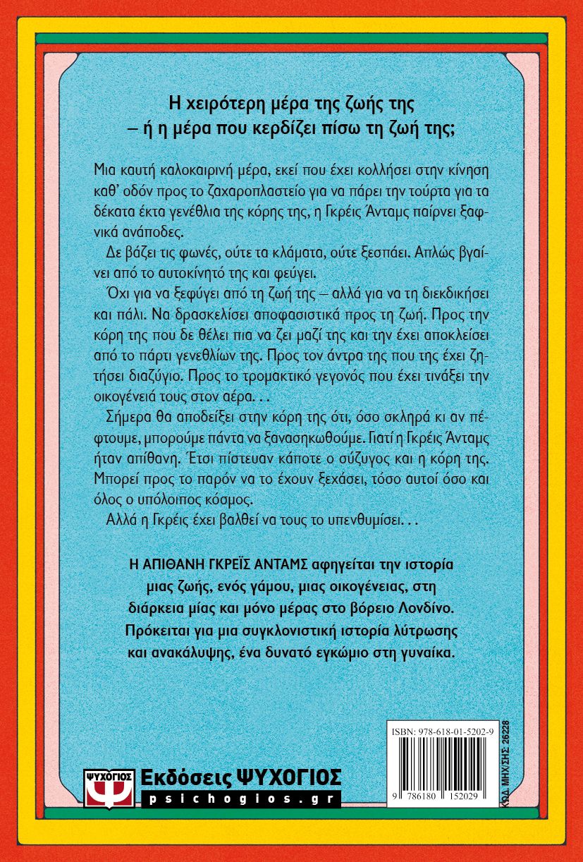 Η χειρότερη μέρα της ζωής της – ή η μέρα που κερδίζει πίσω τη ζωή της; Μια καυτή καλοκαιρινή μέρα, εκεί που έχει κολλήσει στην κίνηση καθ’ οδόν προς το ζαχαροπλαστείο για να πάρει την τούρτα για τα δέκατα έκτα γενέθλια της κόρης της, η Γκρέις Άνταμς παίρνει ξαφνικά ανάποδες. Δε βάζει τις φωνές, ούτε τα κλάματα, ούτε ξεσπάει. Απλώς βγαίνει από το αυτοκίνητό της και φεύγει. Όχι για να ξεφύγει από τη ζωή της – αλλά για να τη διεκδικήσει και πάλι. Να δρασκελίσει αποφασιστικά προς τη ζωή. Προς την κόρη της που δε θέλει πια να ζει μαζί της και την έχει αποκλείσει από το πάρτι γενεθλίων της. Προς τον άντρα της που της έχει ζητήσει διαζύγιο. Προς το τρομακτικό γεγονός που έχει τινάξει την οικογένειά τους στον αέρα… Σήμερα θα αποδείξει στην κόρη της ότι, όσο σκληρά κι αν πέφτουμε, μπορούμε πάντα να ξανασηκωθούμε. Γιατί η Γκρέις Ανταμς ήταν απίθανη. Έτσι πίστευαν κάποτε ο σύζυγος και η κόρη της. Μπορεί προς το παρόν να το έχουν ξεχάσει, τόσο αυτοί όσο και όλος ο υπόλοιπος κόσμος. Αλλά η Γκρέις έχει βαλθεί να τους το υπενθυμίσει. . . Η ΑΠΙΘΑΝΗ ΓΚΡΕΪΣ ΑΝΤΑΜΣ αφηγείται την ιστορία μιας ζωής, ενός γάμου, μιας οικογένειας, στη διάρκεια μίας και μόνο μέρας στο βόρειο Λονδίνο. Πρόκειται για μια συγκλονιστική ιστορία λύτρωσης και ανακάλυψης, ένα δυνατό εγκώμιο στη γυναίκα.