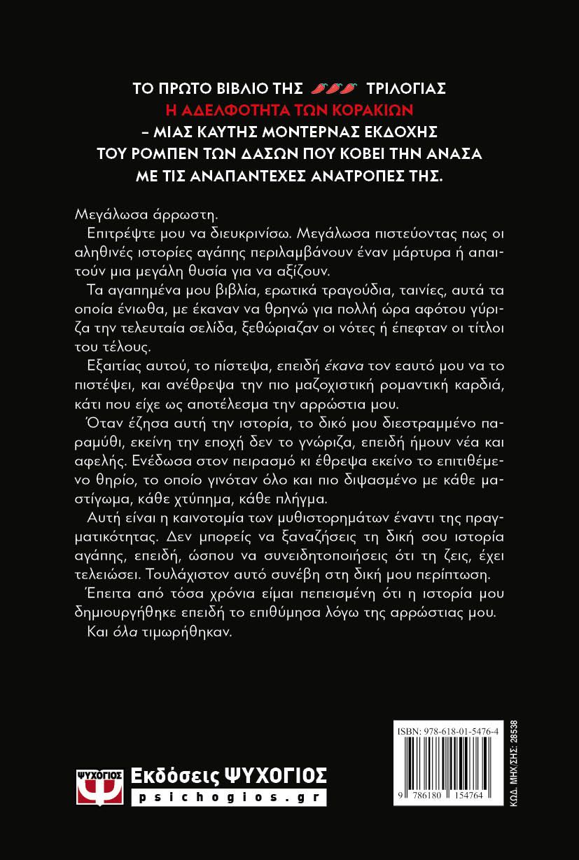 ΤΟ ΠΡΩΤΟ ΒΙΒΛΙΟ ΤΗΣ ΤΡΙΛΟΓΙΑΣ Η ΑΔΕΛΦΟΤΗΤΑ ΤΩΝ ΚΟΡΑΚΙΩΝ – ΜΙΑΣ ΚΑΥΤΗΣ ΜΟΝΤΕΡΝΑΣ ΕΚΔΟΧΗΣ ΤΟΥ ΡΟΜΠΕΝ ΤΩΝ ΔΑΣΩΝ ΠΟΥ ΚΟΒΕΙ ΤΗΝ ΑΝΑΣΑ ΜΕ ΤΙΣ ΑΝΑΠΑΝΤΕΧΕΣ ΑΝΑΤΡΟΠΕΣ ΤΗΣ. Μεγάλωσα άρρωστη. Επιτρέψτε μου να διευκρινίσω. Μεγάλωσα πιστεύοντας πως οι αληθινές ιστορίες αγάπης περιλαμβάνουν έναν μάρτυρα ή απαιτούν μια μεγάλη θυσία για να αξίζουν. Τα αγαπημένα μου βιβλία, ερωτικά τραγούδια, ταινίες, αυτά τα οποία ένιωθα, με έκαναν να θρηνώ για πολλή ώρα αφότου γύριζα την τελευταία σελίδα, ξεθώριαζαν οι νότες ή έπεφταν οι τίτλοι του τέλους. Εξαιτίας αυτού, το πίστεψα, επειδή έκανα τον εαυτό μου να το πιστέψει, και ανέθρεψα την πιο μαζοχιστική ρομαντική καρδιά, κάτι που είχε ως αποτέλεσμα την αρρώστια μου. Όταν έζησα αυτή την ιστορία, το δικό μου διεστραμμένο παραμύθι, εκείνη την εποχή δεν το γνώριζα, επειδή ήμουν νέα και αφελής. Ενέδωσα στον πειρασμό κι έθρεψα εκείνο το επιτιθέμενο θηρίο, το οποίο γινόταν όλο και πιο διψασμένο με κάθε μαστίγωμα, κάθε χτύπημα, κάθε πλήγμα. Αυτή είναι η καινοτομία των μυθιστορημάτων έναντι της πραγματικότητας. Δεν μπορείς να ξαναζήσεις τη δική σου ιστορία αγάπης, επειδή, ώσπου να συνειδητοποιήσεις ότι τη ζεις, έχει τελειώσει. Τουλάχιστον αυτό συνέβη στη δική μου περίπτωση. Έπειτα από τόσα χρόνια είμαι πεπεισμένη ότι η ιστορία μου δημιουργήθηκε επειδή το επιθύμησα λόγω της αρρώστιας μου. Και όλα τιμωρήθηκαν.