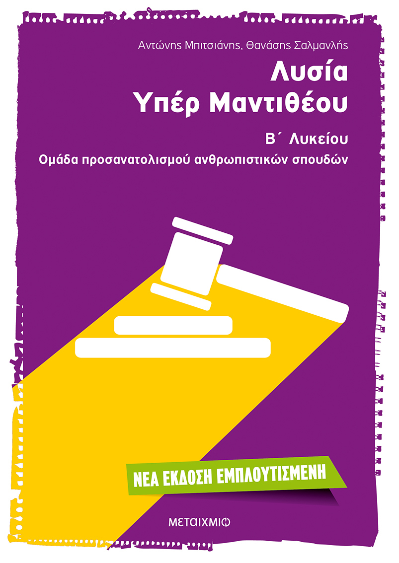 Το βιβλίο αυτό αποτελεί πλήρες βοήθημα για τους μαθητές της Β΄Λυκείου που έχουν επιλέξει την Ομάδα Προσανατολισμού Ανθρωπιστικών Σπουδών όσο και χρήσιμο οδηγό προς τους εκπαιδευτικούς για τη διδασκαλία του ρητορικού λόγου του Λυσία Υπέρ Μαντιθέου.