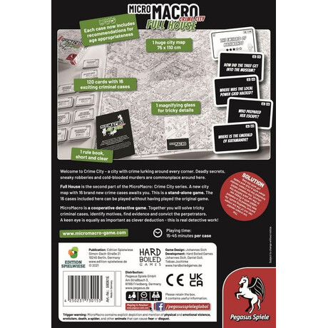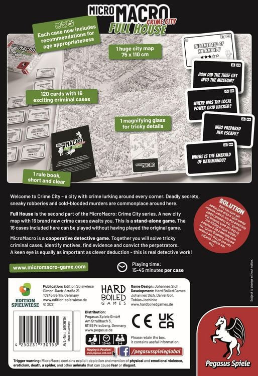 MicroMacro: Crime City – Full House by Pegasus Spiele is a standalone edition of the award-winning MicroMacro series, offering a collection of 16 exciting cases to solve. Players take on the role of detectives in a sprawling black-and-white city map, searching for clues, connecting events, and unraveling mysteries hidden in every corner of Crime City. Each case challenges observation, logic, and teamwork, providing a captivating experience for both new and experienced players.