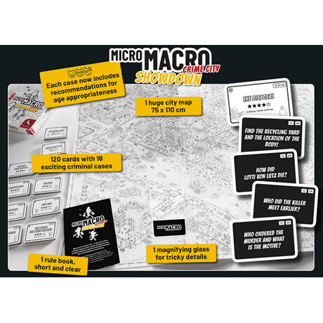 MicroMacro: Crime City – Showdown by Pegasus Spiele is a standalone edition in the acclaimed MicroMacro series, featuring 16 brand-new cases set in a detailed black-and-white city map. Players step into the shoes of detectives, investigating complex crimes, searching for clues, and connecting events to solve each case. Every scenario provides a mix of observation, logical reasoning, and teamwork, delivering an immersive detective experience.