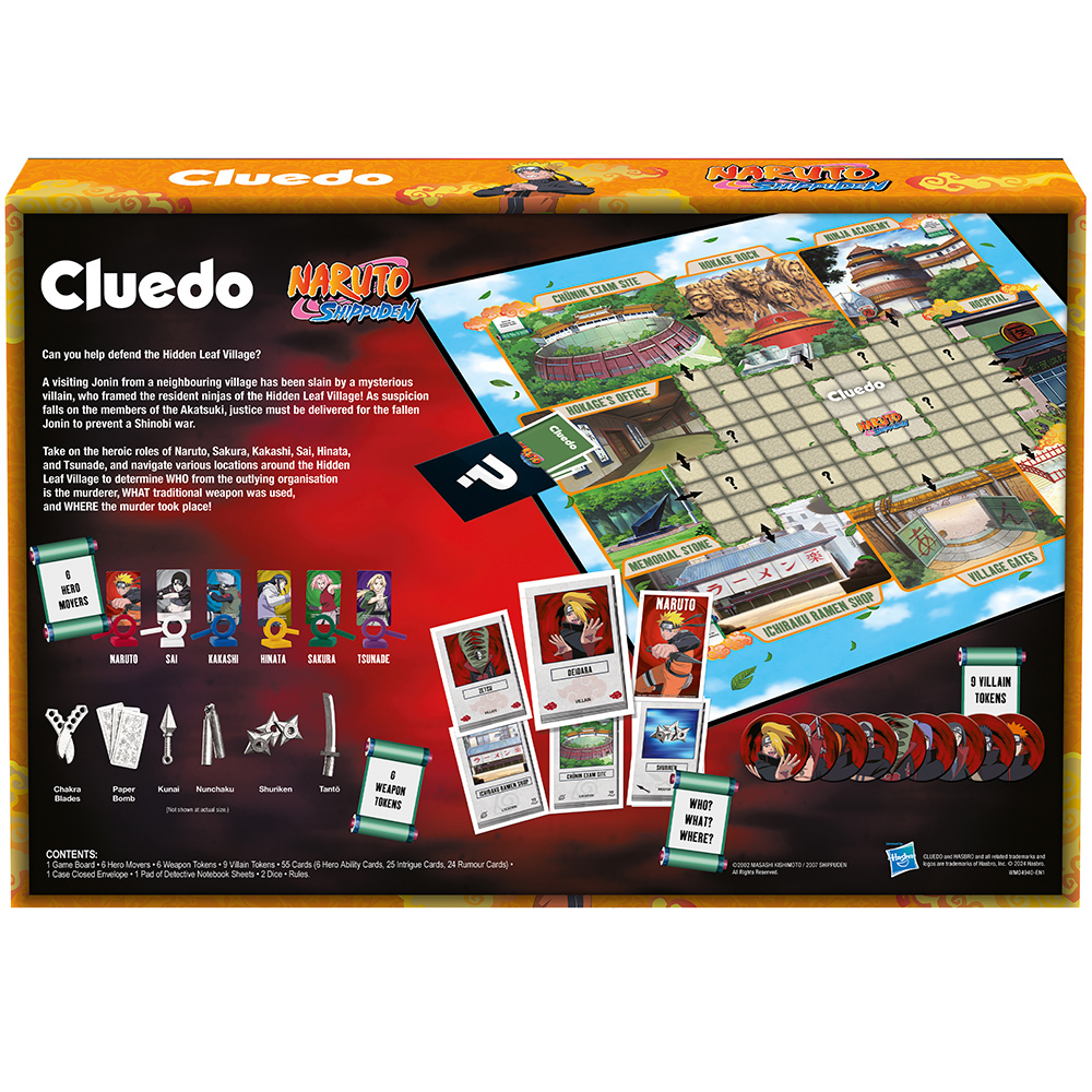 Συνδυάζοντας το αγαπημένο gameplay του Cluedo με τον συναρπαστικό κόσμο του Naruto, το παιχνίδι προσφέρει ένταση, διασκέδαση και ανταγωνισμό, ιδανικό για φίλους και οικογένεια. Η αγγλική έκδοση (EN) το καθιστά κατάλληλο και για εξάσκηση της γλώσσας μέσα από το παιχνίδι.