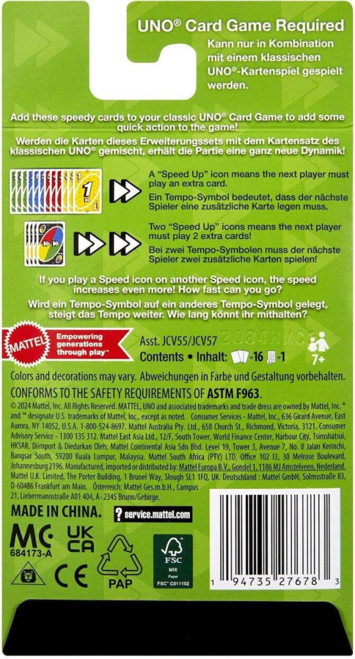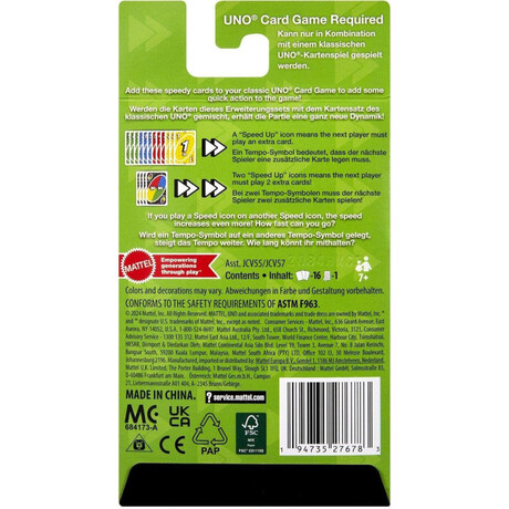 Εμπλούτισε το παιχνίδι σου UNO με το σετ Add-On Pack Κάρτες Ταχύτητας, προσθέτοντας γρήγορες κινήσεις και νέες στρατηγικές για ακόμα πιο συναρπαστικούς γύρους.