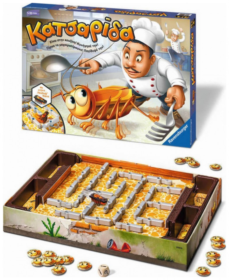 Μπλιαααχ… Κατσαρίδα στην κουζίνα! Γρήγορα, πιάσ την! Ρίξε το ζάρι και δες αν μπορείς να γυρίσεις πιρούνι, κουτάλι ή μαχαίρι. Αντέδρασε γρήγορα, χρησιμοποίησε τα κουταλομαχαιροπίρουνα και οδήγησε την κατσαρίδα στην παγίδα σου. Κάθε φορά που την παγιδεύεις παίρνεις μια κατσαριδόμαρκα. Ο πρώτος παίκτης που θα συγκεντρώσει 5 κατσαριδόμαρκες, κερδίζει το παιχνίδι.