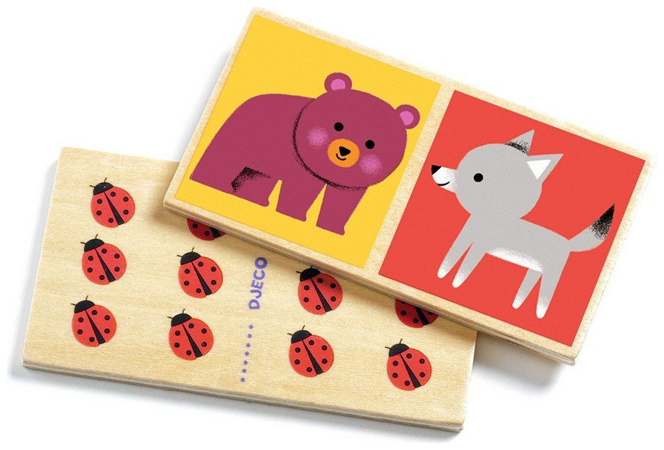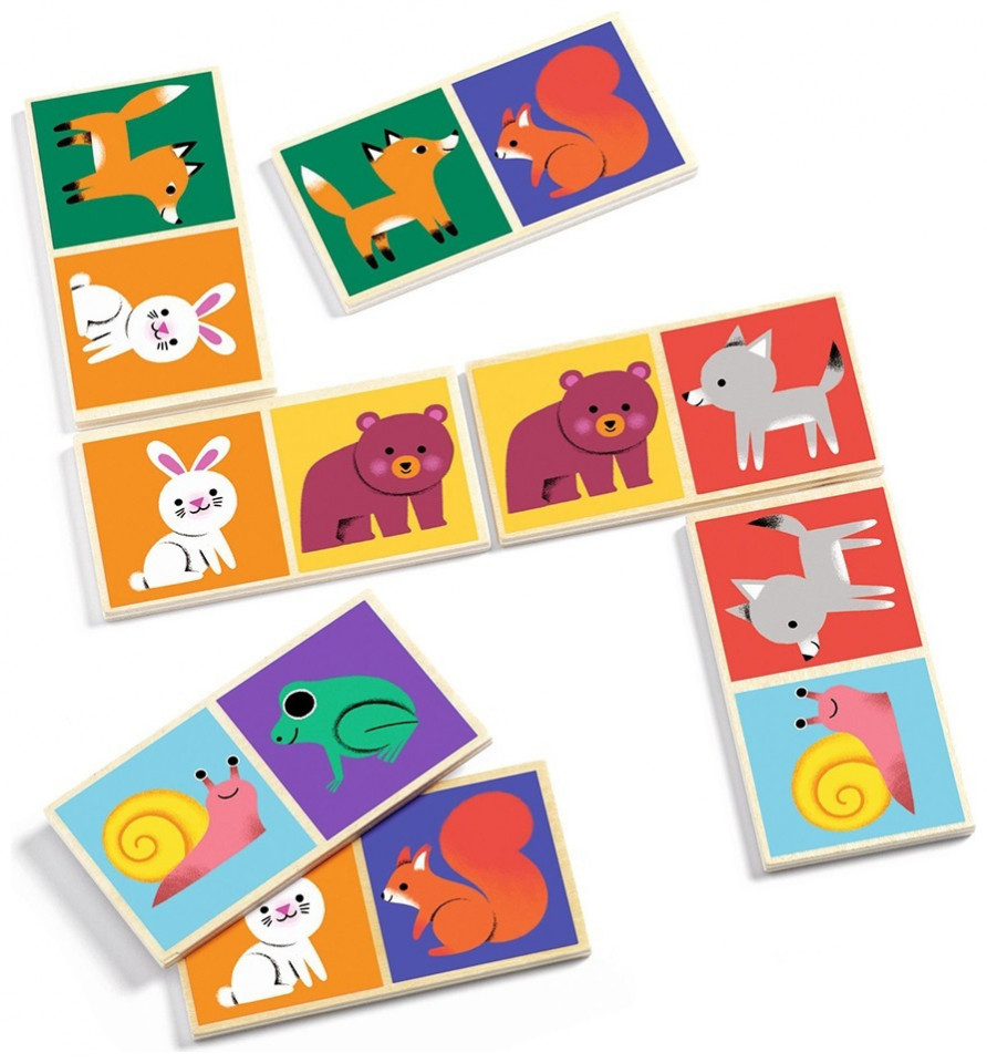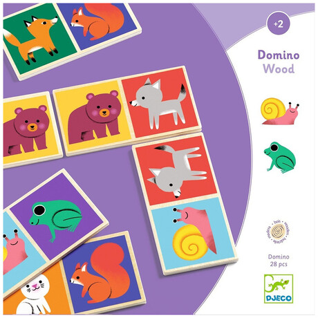 Εκπαιδευτικό παιχνίδι της εταιρείας Djeco που περιλαμβάνει 28 ξύλινα ντόμινο διπλής όψης με θέμα τα ζώα του δάσους. Το παιδί συγκεντρώνει τα ζώα ή τους αριθμούς για να σχηματίσει μια λογική ακολουθία με όμοιες εικόνες στη σειρά. Τα πλακίδια έχουν όμορφες εικονογραφήσεις ζώων από τη μία πλευρά και κουκκίδες από την άλλη. Ο πρώτος που θα τοποθετήσει όλα τα ντόμινό του κερδίζει. Ένα εκπαιδευτικό παιχνίδι που βοηθά στην εξάσκηση του μετρήματος καθώς επίσης και στη σύνδεση ποσοτήτων ή εικόνων διασκεδάζοντας.