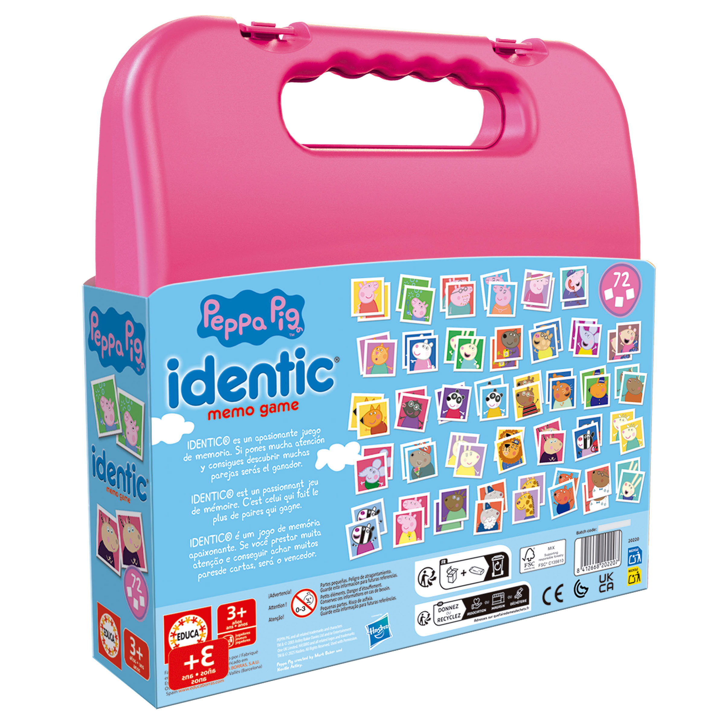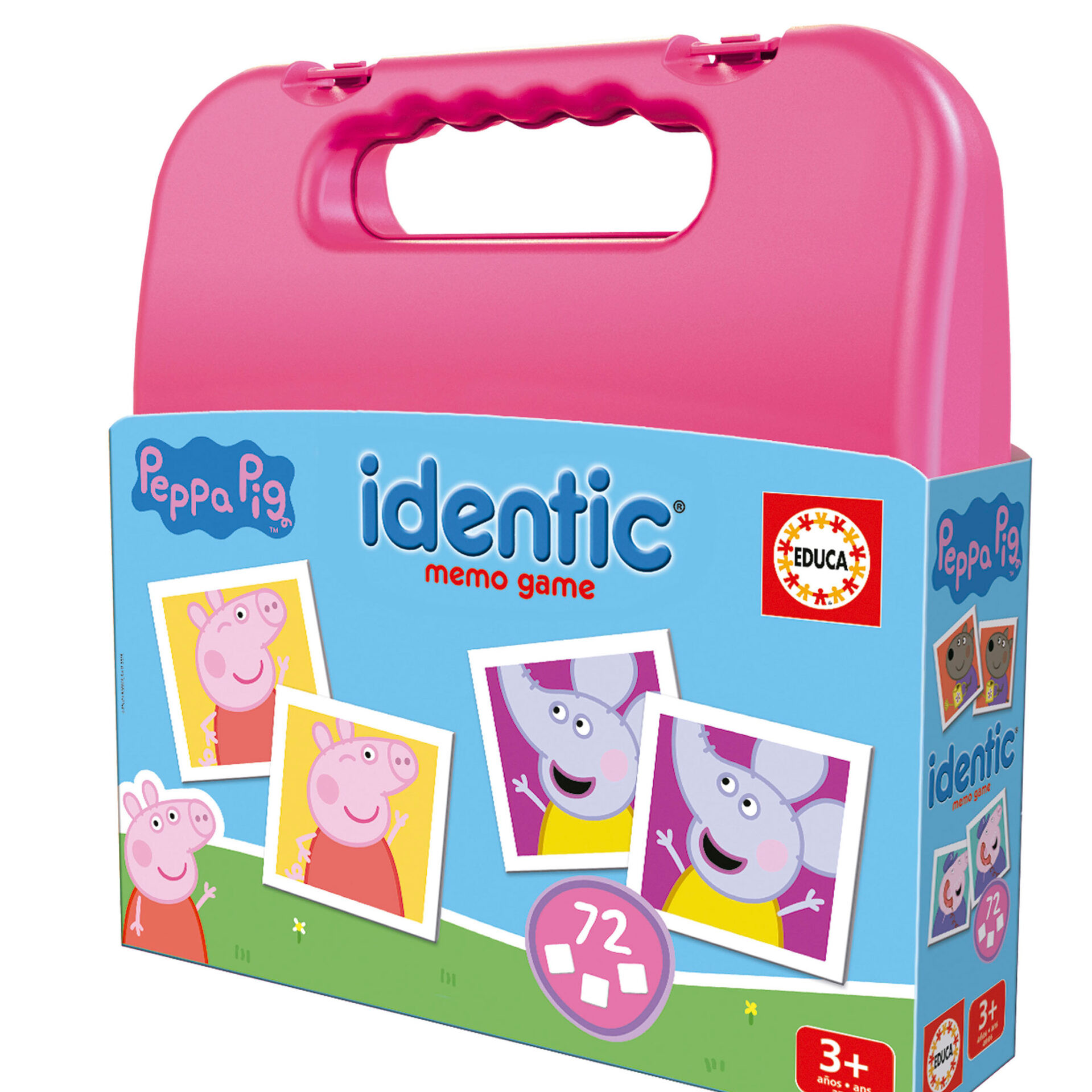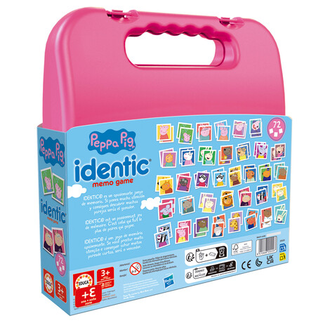 Το Educa Kid Board Game Memo Identic Peppa είναι ένα παιδικό επιτραπέζιο παιχνίδι μνήμης με θέμα την αγαπημένη Peppa Pig, σχεδιασμένο για να διασκεδάζει και να εκπαιδεύει τα παιδιά μέσα από ένα απλό και διασκεδαστικό παιχνίδι εύρεσης ίδιων εικόνων. Κάθε γύρος ενισχύει τη μνήμη, την παρατηρητικότητα και την συγκέντρωση, καθώς οι παίκτες προσπαθούν να βρουν τα ίδια ζευγάρια καρτών με τις εικόνες της Peppa και των φίλων της.