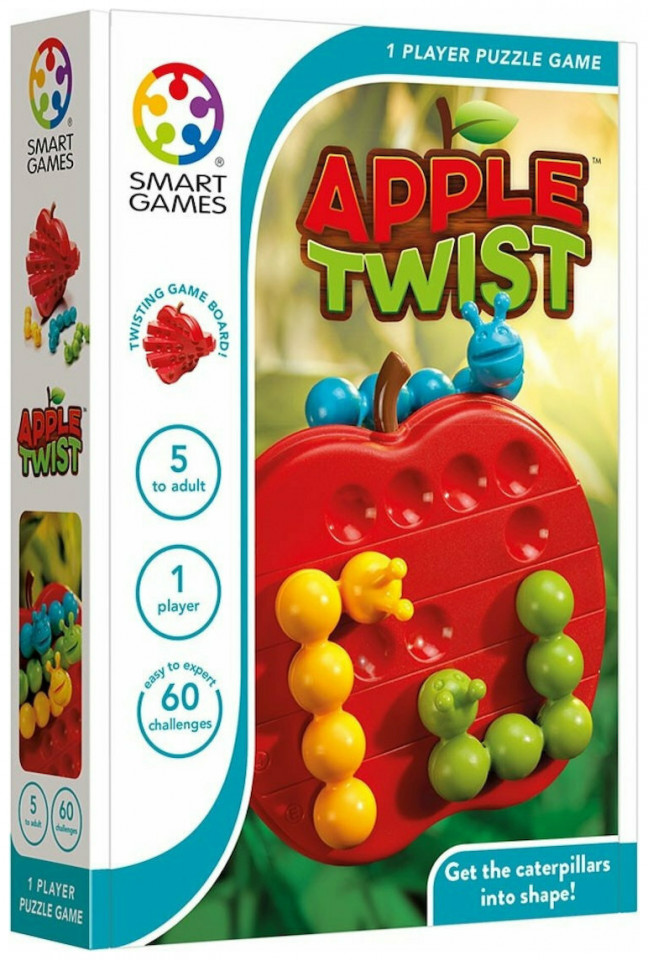 Τρεις πεινασμένες κάμπιες θέλουν να φάνε από το ίδιο μήλο. Μπορείτε να τις λυγίσετε στο σωστό σχήμα; Αυτό το παιχνίδι λογικής της εταιρείας Smart Games απαιτεί ευέλικτη σκέψη! Όχι μόνο ρυθμίζονται οι κάμπιες, αλλά και το ίδιο το επιτραπέζιο μπορεί να περιστραφεί! Με 60 προκλήσεις κλιμακούμενης δυσκολίας, το AppleTwist προσφέρει “άφθονη τροφή για σκέψη”.