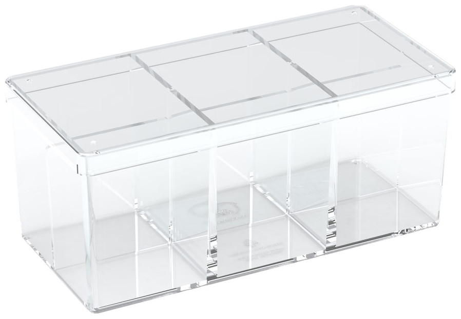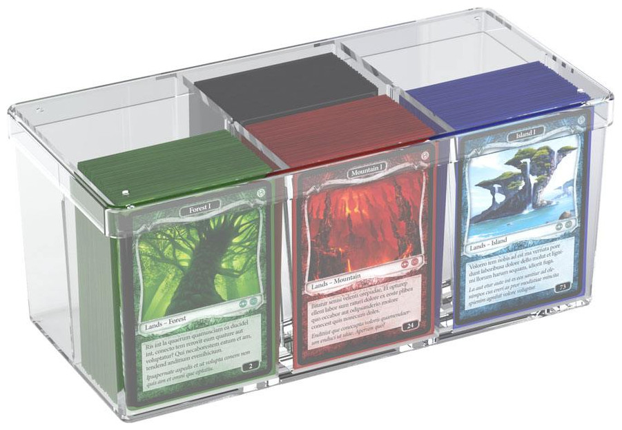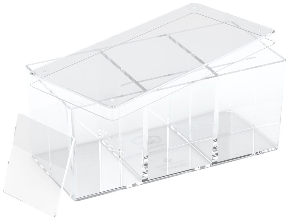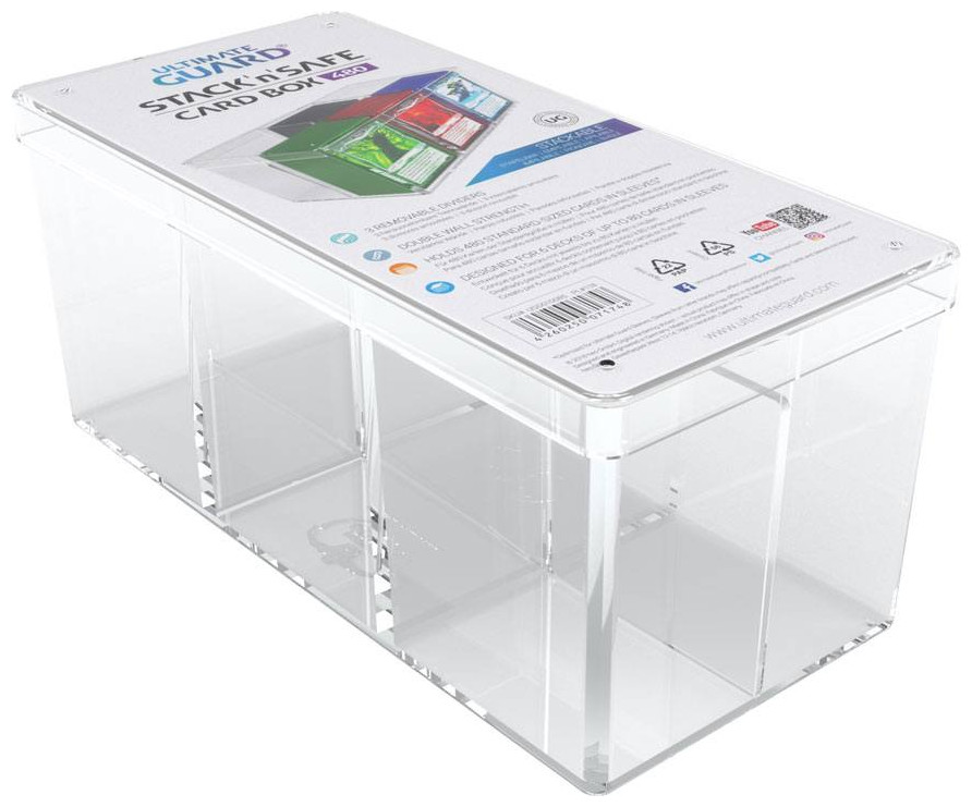 The Stack´n´Safe Box 480 from UG´s line of high quality card boxes is made of clear polystyrene and can hold up to 480 (6 x 80) cards in sleeves (e.g. ULTIMATE GUARD Supreme Sleeves). The sturdy box has 6 equally sized compartments and features three removable dividers. The easy to remove lid fits perfectly and keeps your cards safely in place.