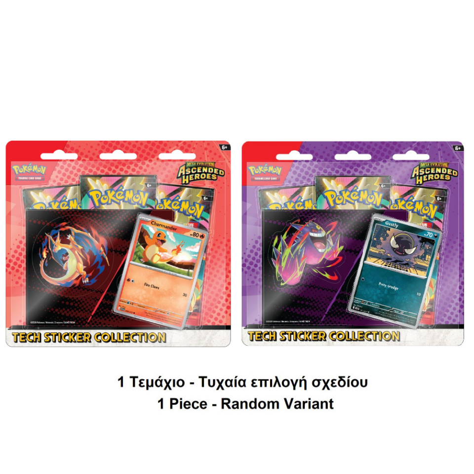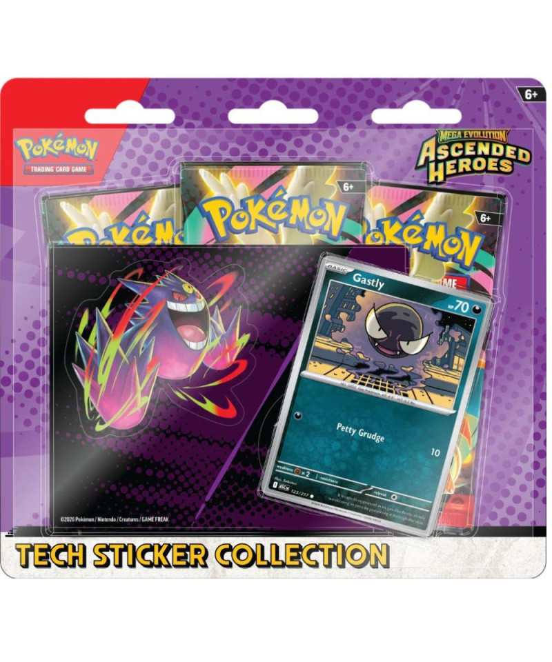 The Pokémon TCG: Mega Evolution—Ascended Heroes Tech Sticker Collection includes: 1 foil promo card featuring Charmander or Gastly 1 tech sticker sheet 3 Pokémon TCG: Mega Evolution—Ascended Heroes booster packs