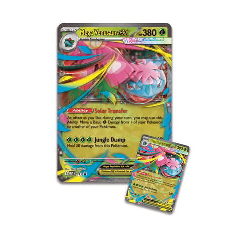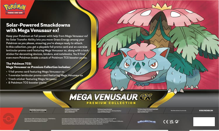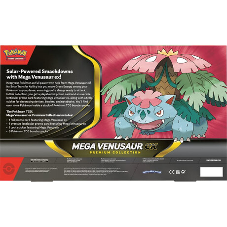 The Pokémon TCG Mega Venusaur ex Premium Collection is a premium collector’s box featuring exclusive Mega Venusaur items and multiple booster packs. It includes special foil promo cards, an oversized lenticular card, and a themed sticker, making it ideal for collectors and competitive players.