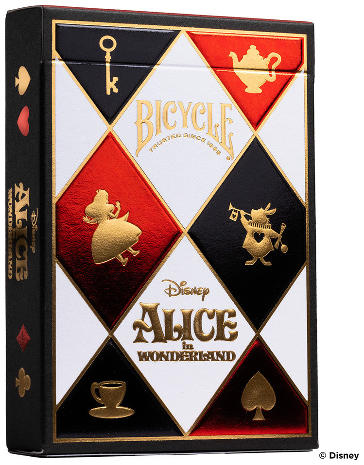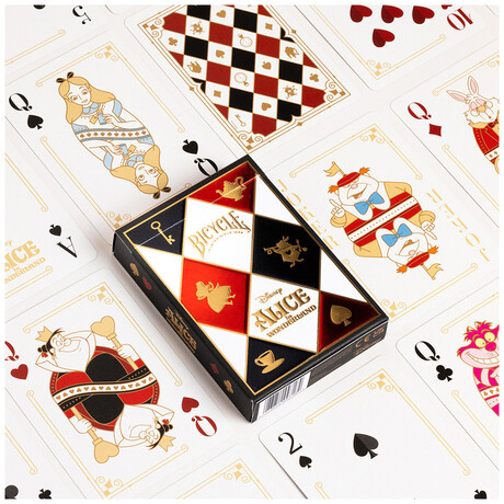 Οι φιγούρες των court cards έχουν ειδικό σχεδιασμό και απεικονίζουν αγαπημένους χαρακτήρες όπως η Αλίκη, ο Τρελός Καπελάς και η μυστηριώδης γάτα Cheshire, κάνοντας κάθε παιχνίδι ακόμη πιο θεματικό και διασκεδαστικό. Η τράπουλα κατασκευάζεται από την United States Playing Card Company στις ΗΠΑ, με την κλασική ποιότητα Bicycle και φινίρισμα Air-Cushion® για ομαλή ανάμειξη και ανθεκτικότητα.