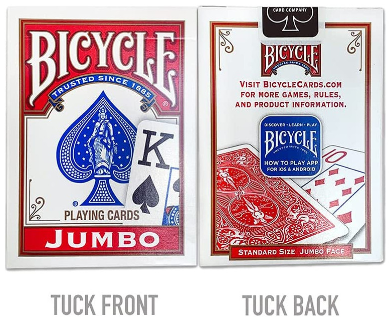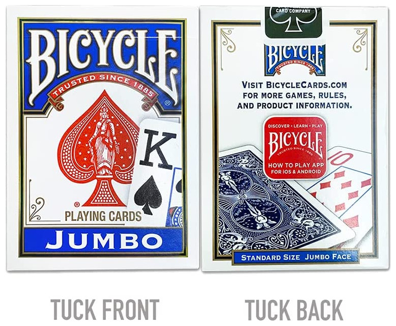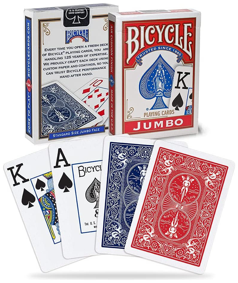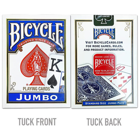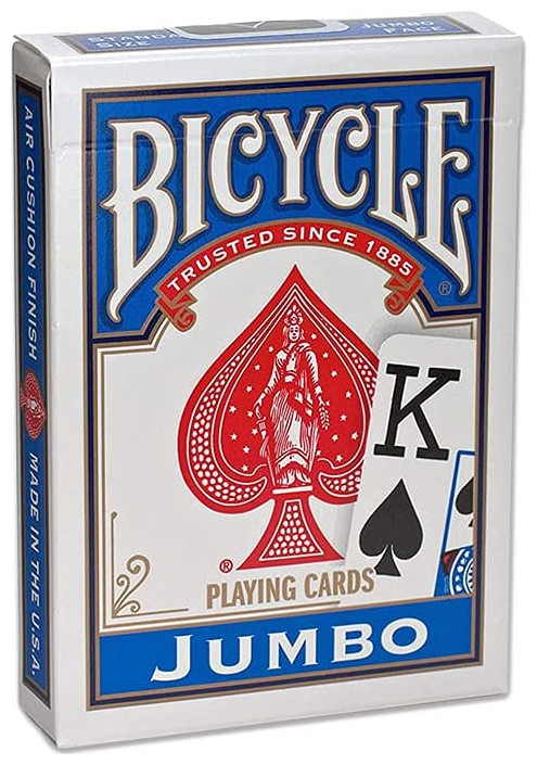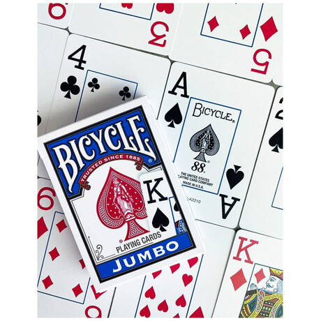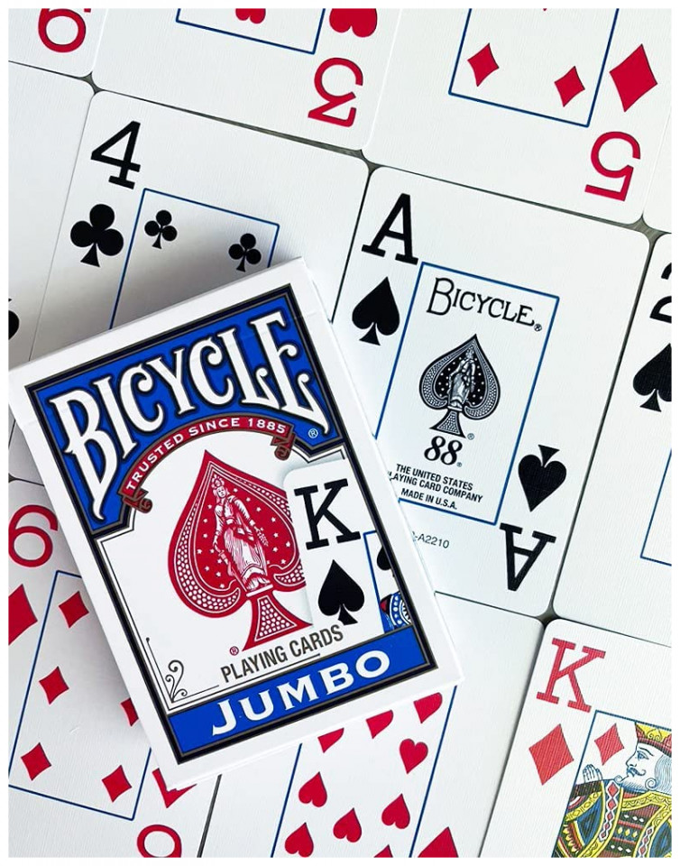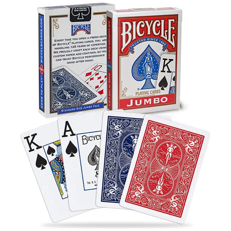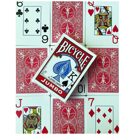 H τράπουλα Bicycle Jumbo πρόκειται για την κλασσική τράπουλα της εταιρείας έχοντας διαφοροποιημένα τα γράμματα κ τους αριθμούς, τα οποία είναι σε μέγεθος Jumbo διατηρώντας την απαράμιλη ποιότητα της Bicycle. Έχει τυπωθεί σε υψηλή ανάλυση που θα εντυπωσιάσει εσάς και τους καλεσμένους σας!