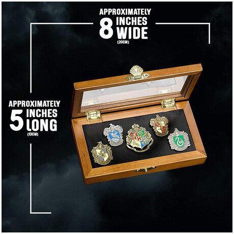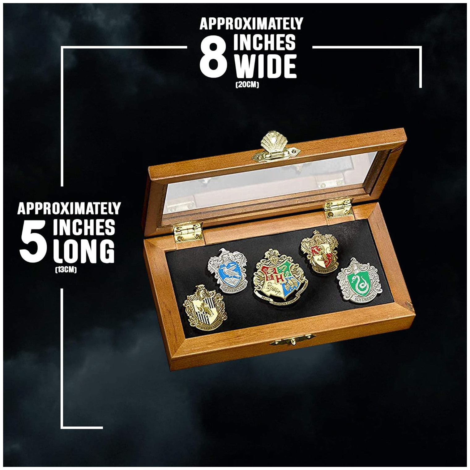 DISPLAY CASE INCLUDED: This collectors set includes a wood display case with a plastic window to keep the beautiful Harry Potter pin badges safe and secure. This box measures a compact 8 x 5 x 2in (20 x 13 x 6cm) (LxWxD).