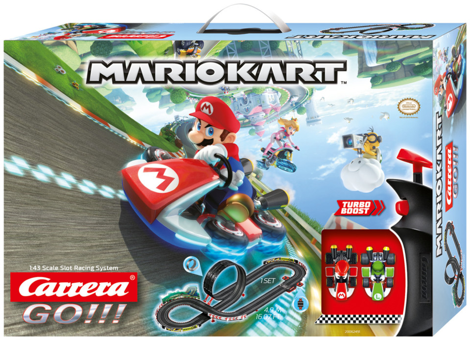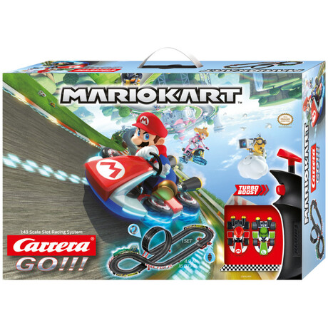 Το σετ Nintendo Mario Kart 8 της Carrera GO περιλαμβάνει δύο τηλεκατευθυνόμενα αυτοκίνητα και θα είναι η καλύτερη έκπληξη για τα παιδιά που λατρεύουν το Mario Kart. Τα χειριστήρια ταχύτητας είναι ειδικά σχεδιασμένα για παιδιά. Περιλαμβάνονται δύο αυτοκίνητα Nintendo Mario Kart 8 με τον Mario και τον Luigi, καθώς και μία πίστα 4,9 μ. Επιπλέον, περιλαμβάνεται ο απαιτούμενος προσαρμογέας. Το σετ Carrera GO!!! Nintendo Mario Kart 8 εγγυάται αμέτρητες στιγμές αγωνιστικής διασκέδασης για όλη την οικογένεια.