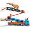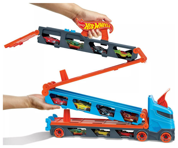 Ένα ασφαλές μάνδαλο στο πίσω μέρος ανοίγει και τραβά προς τα έξω για να δημιουργήσει μια πίστα αγώνων μήκους 1,80 μέτρων.Το όχημα μεταφοράς Hot Wheels έρχεται με 3 αυτοκίνητα Hot Wheels και χώρο για τη μεταφορά περισσότερων από 20 (επιπλέον αυτοκίνητα πωλούνται ξεχωριστά).