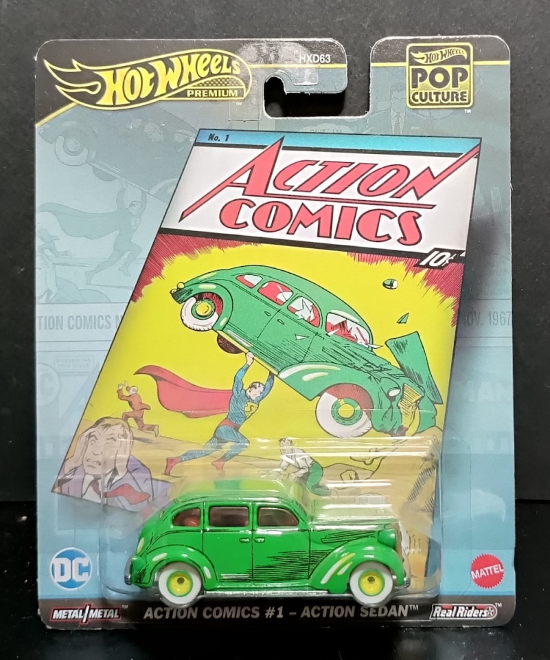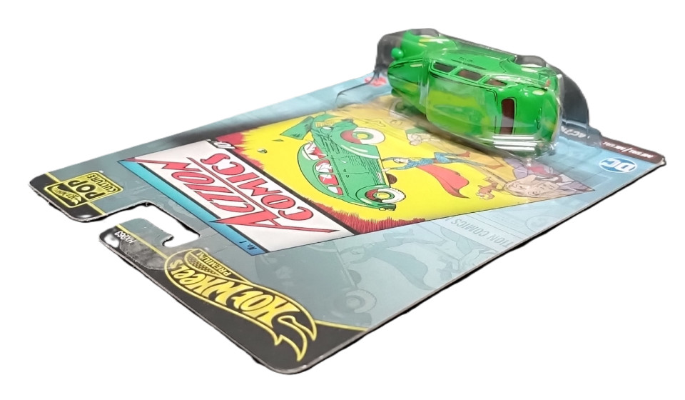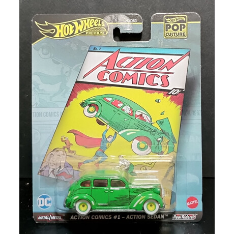 Συλλεκτικό μοντέλο Hot Wheels Pop Culture εμπνευσμένο από το πρώτο τεύχος των Action Comics, με το θρυλικό Action Sedan του Superman, ιδανικό για συλλέκτες και λάτρεις των κόμικς.
