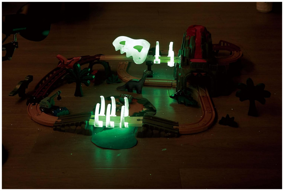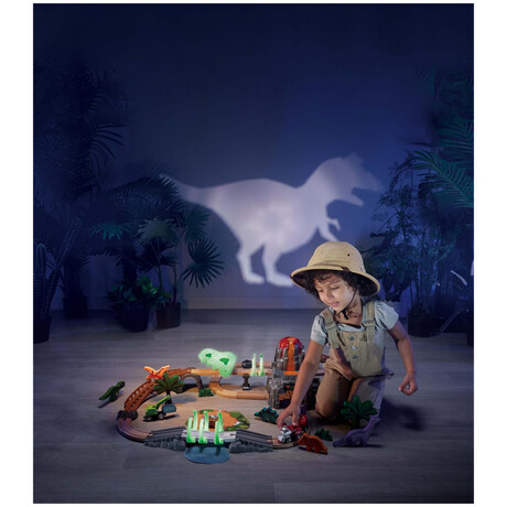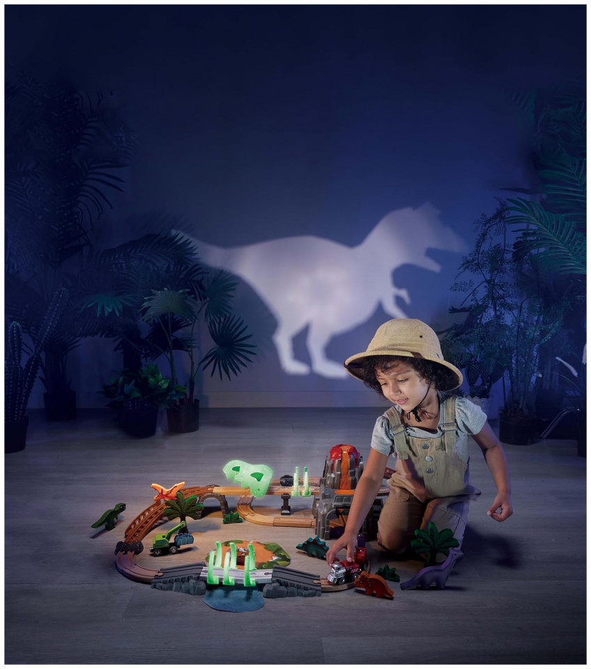 AN IMMERSIVE DINO WORLD: There are plenty of interactive elements to keep children engaged for example, the dinosaur skull and bones are made of special plastic material that can glow in the dark. Plus the dinosaur skull lifts, the crane transports cargo to the train, and when a train passes through the rib cage, you`ll hear exciting sound effects.