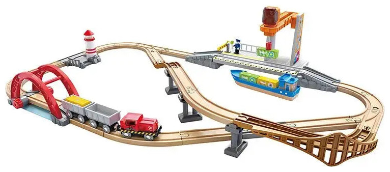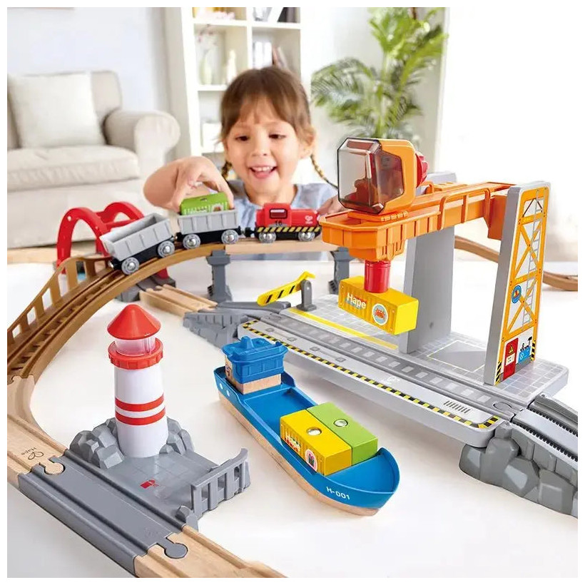 Discover the wonders of freight trains as you learn to transport cargo from the ships onto the railways on land. Transport the important cargo from ships to trains. You can lift the bridge to let the ships pass and even turn on the lighthouse to send signals out to sea. When the train passes over the special rail, you'll hear exciting sound effects like a train whistle and the crashing ocean waves. This set can also be connected to other Hape railway sets for neverending railway fun!