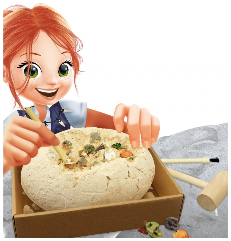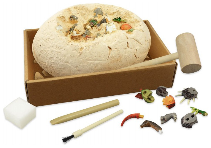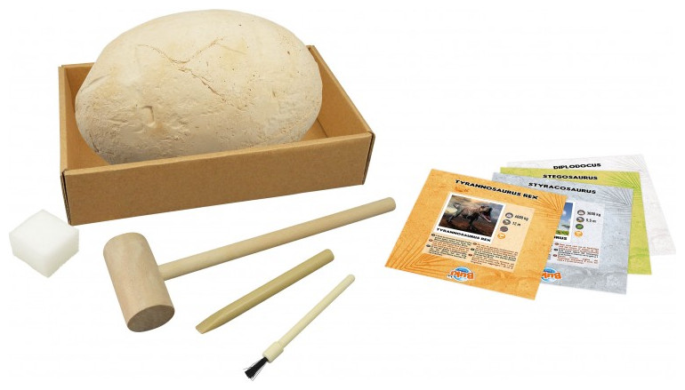 Ξεθάψτε τέσσερα τρισδιάστατα παζλ δεινοσαύρων από το γιγάντιο γύψινο αυγό των 20 εκατοστών: Τυραννόσαυρος, Διπλόδοκος, Στεγόσαυρος και Στυρακόσαυρος.