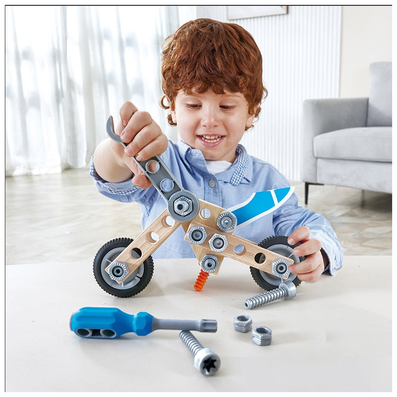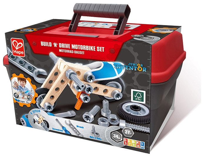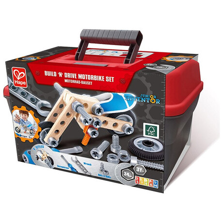 Build your very own motorbike with wheels that actually turn! This great set includes wooden sections, screws, nuts and everything else you need to build your very own vehicle! Choose between four motorbikes to build or create your own fantasy vehicle!