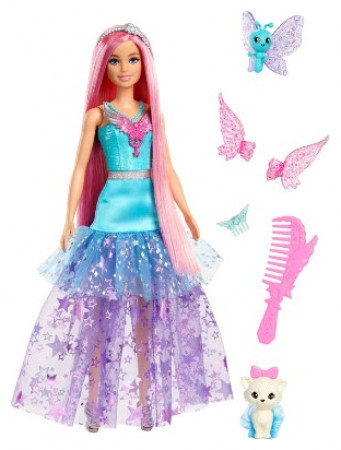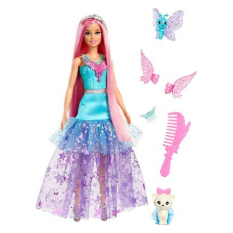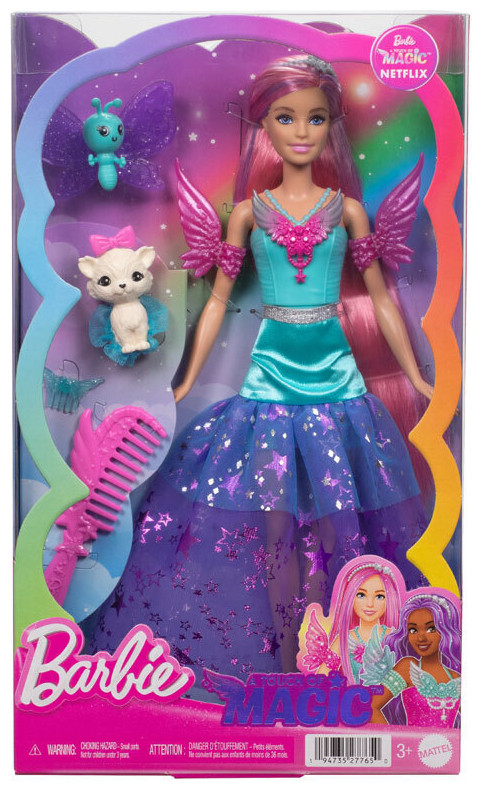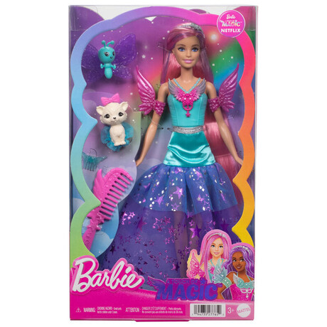 Αυτή η κούκλα Barbie μόνο μαγική μπορεί να χαρακτηριστεί με τα μακριά φανταστικά μαλλιά της και το αστραφτερό φόρεμά της! Έχει μωβ μαλλιά μήκους 17,78 εκατοστών και περιλαμβάνει αξεσουάρ όπως χτένα, αστραφτερή κορδέλα και διακοσμητική καρφίτσα μαλλιών. Η κούκλα Barbie 'Malibu' Roberts φοράει ένα αστραφτερό ντύσιμο εμπνευσμένο από την εμφάνισή της στο Barbie A Touch of Magic. Δύο κατοικίδια και αξεσουάρ styling προσθέτουν στη φανταστική διασκέδαση! Έρχεται με μια αξιολάτρευτη φίλη πεταλούδα, καθώς και ένα κατοικίδιο κουτάβι που φοράει ένα σούπερ χαριτωμένο tutu. Η κούκλα δεν μπορεί να σταθεί μόνη της. Τα χρώματα και τα διακοσμητικά μπορεί να διαφέρουν.