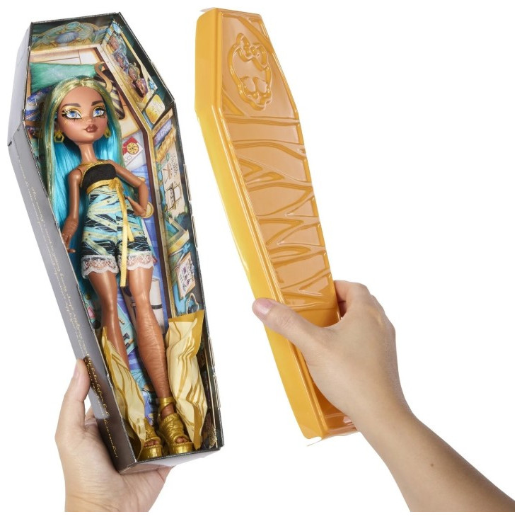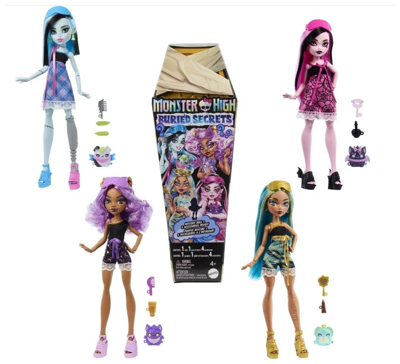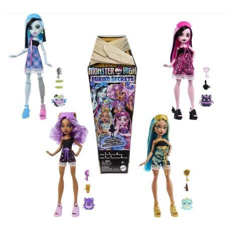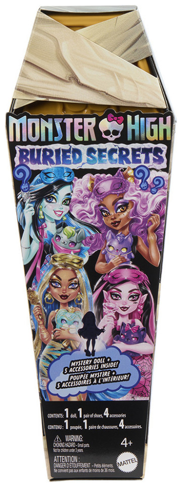Το πλήρωμα boo είναι υπό κάλυψη! Οι κούκλες Monster High Buried Secrets προσφέρουν μια ανατριχιαστική εμπειρία unboxing με μια μυστηριώδη κούκλα και 5 αξεσουάρ Cozy Creepover. Ξετυλίξτε τα περιτυλίγματα της μούμιας για να ανακαλύψετε ποιο μακάβριο γκουλ κρύβεται μέσα στη συσκευασία της σαρκοφάγου - θα είναι η Κλειώ Ντε Νιλ, η Δρακουλαούρα, η Φράνκι Στάιν ή η Κλαουτίν Λύκος; Η τρομακτική έκπληξη είναι η μισή διασκέδαση!