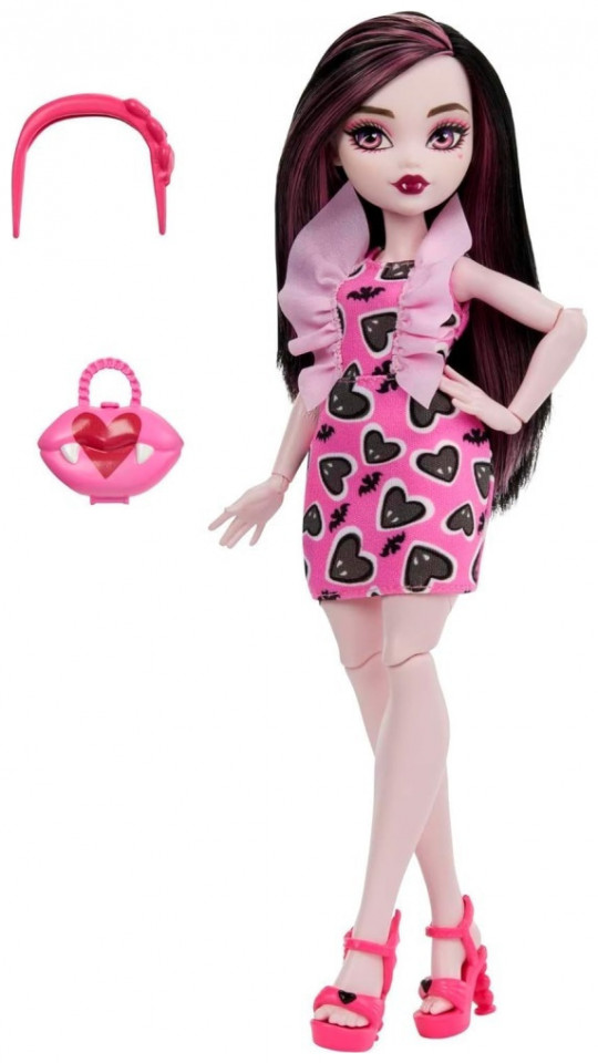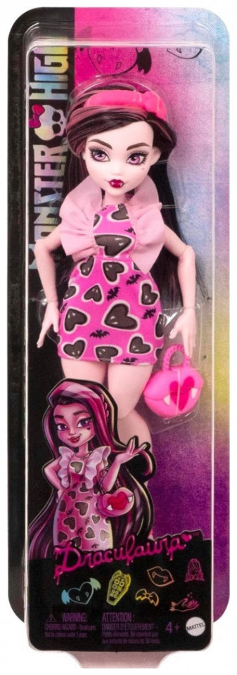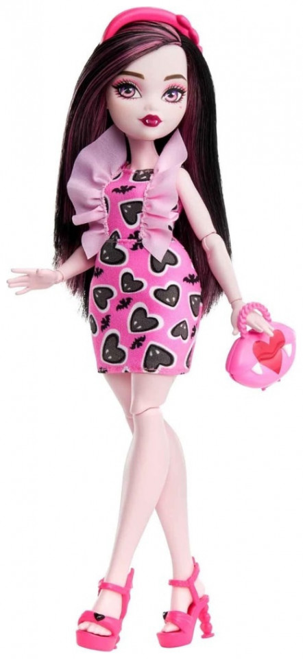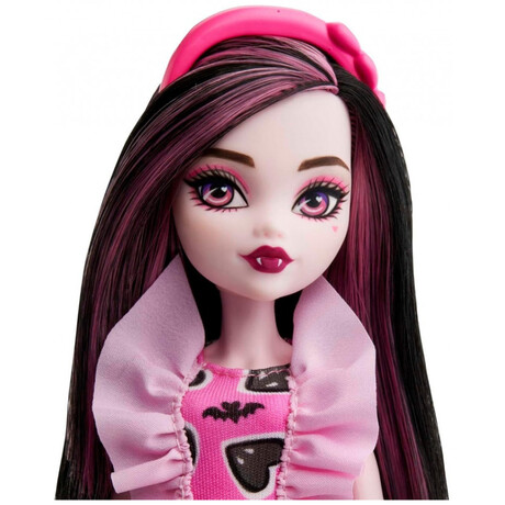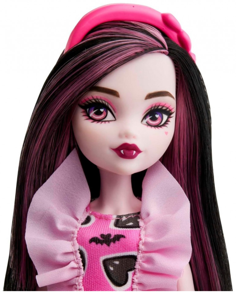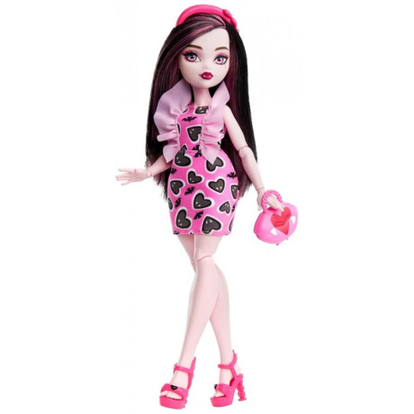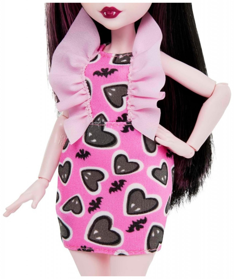 Η κούκλα Monster High Draculaura είναι τρομερά μοντέρνα όπως πάντα! Τα αξεσουάρ styling ενισχύουν τις δυνατότητες για παιχνίδι μόδας και φαντασμαγορική αφήγηση. Η Draculaura είναι φανταστική με ροζ μίνι φόρεμα με στάμπα καρδιάς και statement βολάν στο μπούστο. Μια ροζ κορδέλα και ασορτί γόβες ολοκληρώνουν το εξαιρετικά σύνολό της. Όταν το βαμπίρ είδε την τσάντα της σε σχήμα χείλους με κυνόδοντες, ήταν αγάπη με την πρώτη δαγκωνία! Η κούκλα Draculaura έχει 11 σημεία άρθρωσης, επιτρέποντας στα παιδιά να τα τοποθετήσουν σε κάθε είδους στάσεις για πιο ρεαλιστικό παιχνίδι!