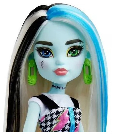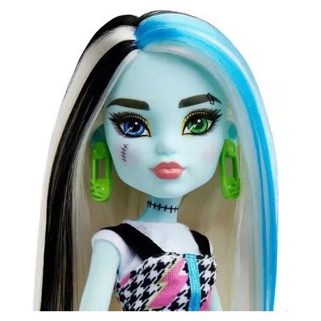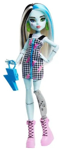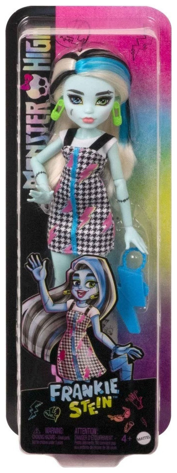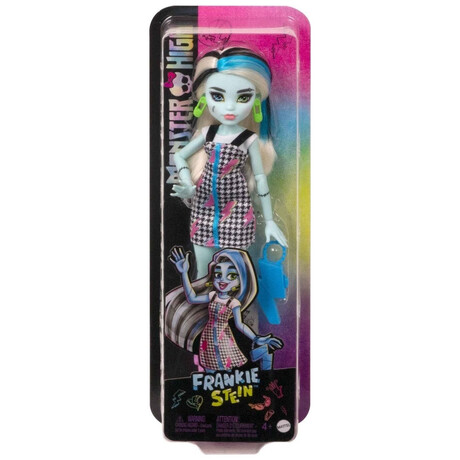 Η κούκλα Monster High Frankie Stein είναι τόσο υπέροχη όσο πάντα! Τα αξεσουάρ styling ενισχύουν τις δυνατότητες για παιχνίδι μόδας και φαντασμαγορική αφήγηση. Η κούκλα Monster High Frankie Stein φοράει φόρεμα με ροζ γραφικά αστραπής. Πράσινα σκουλαρίκια με καρφίτσα ασφαλείας και ογκώδεις μπότες με κορδόνια ολοκληρώνουν το εξαιρετικό σύνολο τους. Η τσάντα σε σχήμα κεραυνού τράβηξε την προσοχή μόλις την είδαν! Η κούκλα Frankie Stein έχει 11 σημεία άρθρωσης, επιτρέποντας στα παιδιά να τα τοποθετήσουν σε κάθε είδους στάσεις για πιο ρεαλιστικό παιχνίδι!