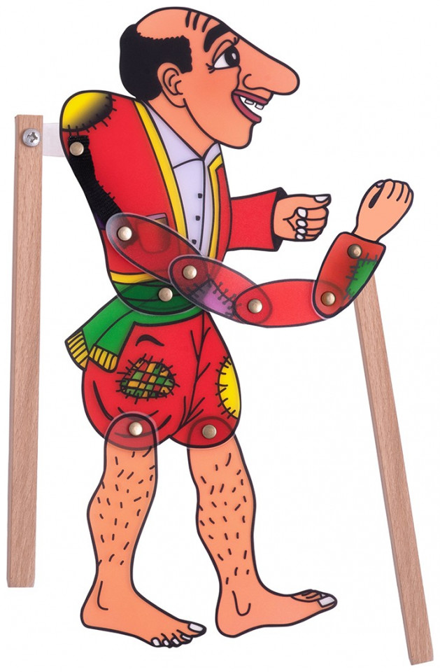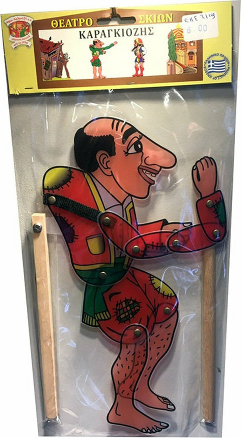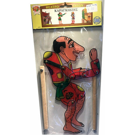 Πλαστική φιγούρα Καραγκιόζη με ξύλινη χειρολαβή προσαρτημένη και έτοιμη για παιχνίδι. Είναι τέλειος τύπος ανθρώπου του λαού. Ευφυολόγος, τραγουδιστής, καλόκαρδος, πατριώτης, πολιτικός, ετοιμόλογος, ερωτιάρης. Πότε είναι πλούσιος, πότε φτωχός, πότε κάνει τον κουτό, πότε τον παλικαρά. Τον βρίσκεις παντού…