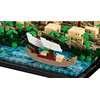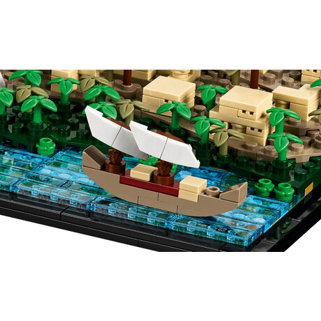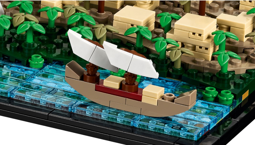 - Detailed landscape – A section of the Nile river with 2 LEGO® brick versions of feluccas (ancient boats), 2 small pyramids, 2 mortuary temples, Sphinx statues, a workers’ village and an obelisk