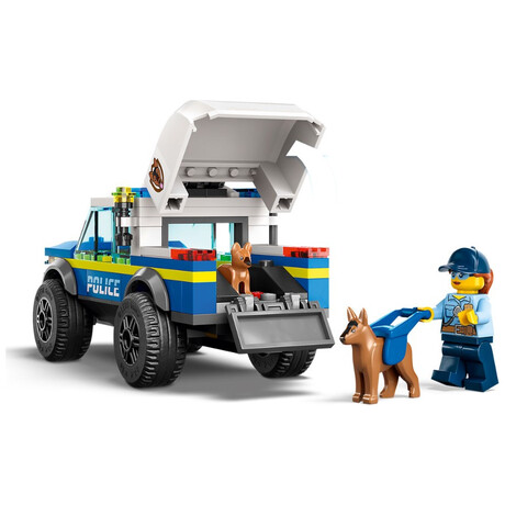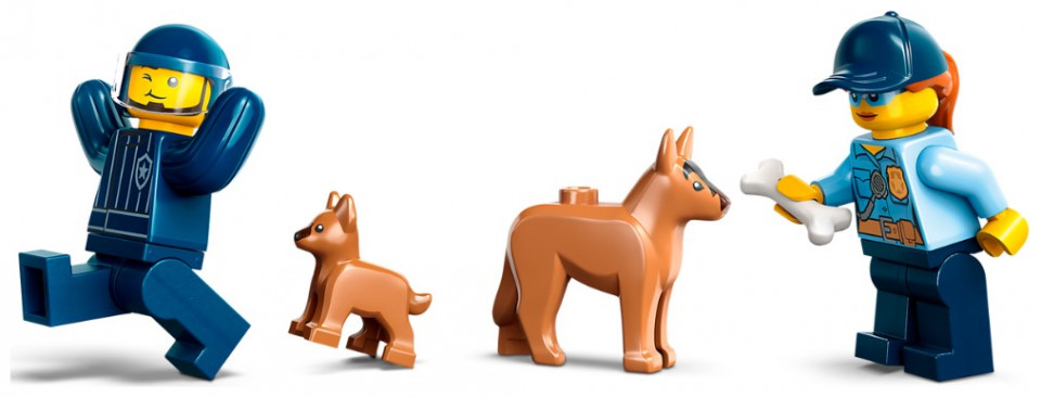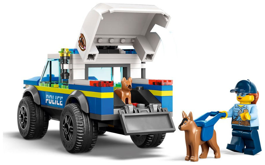 - What’s in the box? – Everything kids need to build a toy police K9 SUV, trailer, 3 dog-training apparatus and a training ground setting, plus 2 minifigures, a dog figure and a puppy figure
