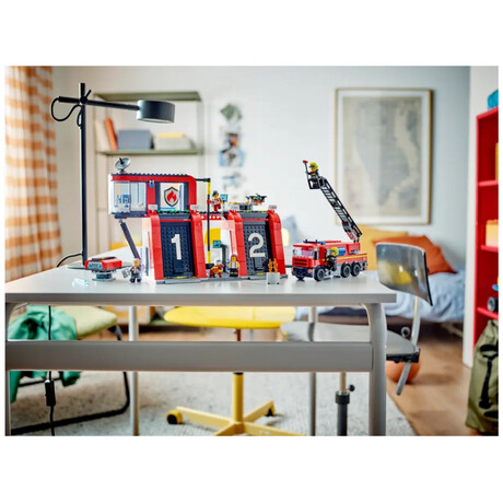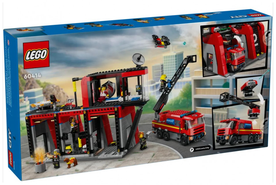 Spark kids’ imaginations with the LEGO® City Fire Station with Fire Truck (60414) toy playset for ages 6 and up. The station features a modern control center, kitchenette and sleeping quarters above an equipment area and 2 garages with tall up-and-over doors. The set also includes a toy drone and a cool fire engine with a modular ladder and extinguisher attachments. Mobilize the 5 fire-crew minifigures and fire dog figure for hours of action-packed firefighting role play. Kids can use this set with others from the LEGO City range (sold separately) for even bigger adventures!