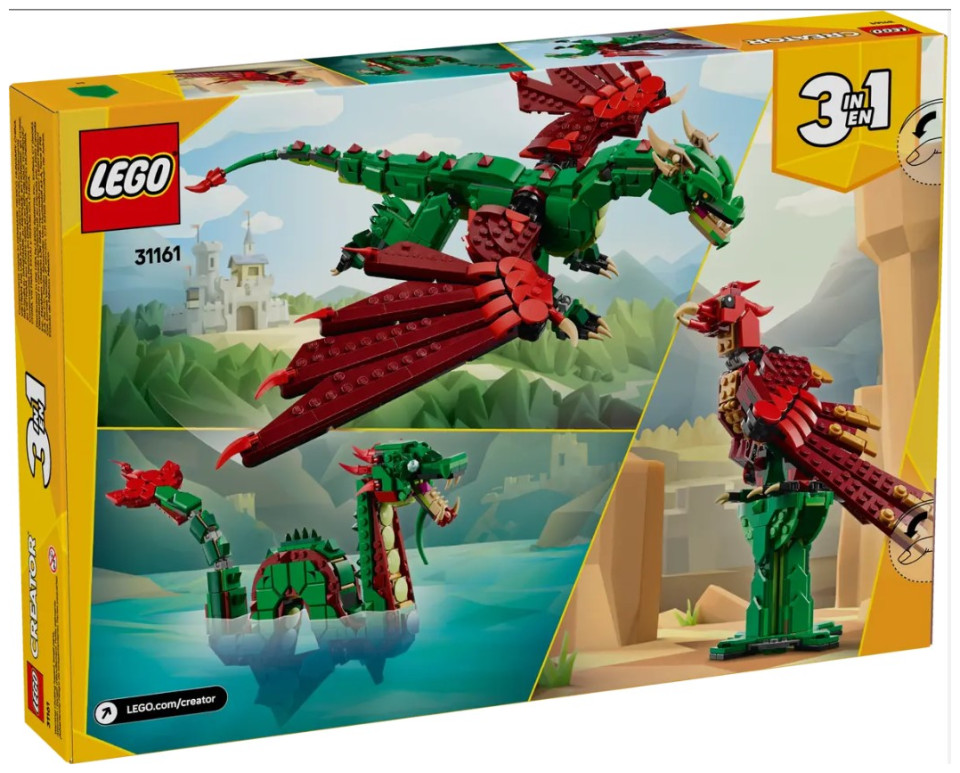 - 3 medieval creature toys in 1 box – The LEGO® Creator 3in1 Medieval Dragon toy lets boys and girls aged 9 and up build and rebuild 3 different fantasy animal toys using the same bricks