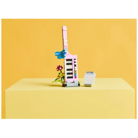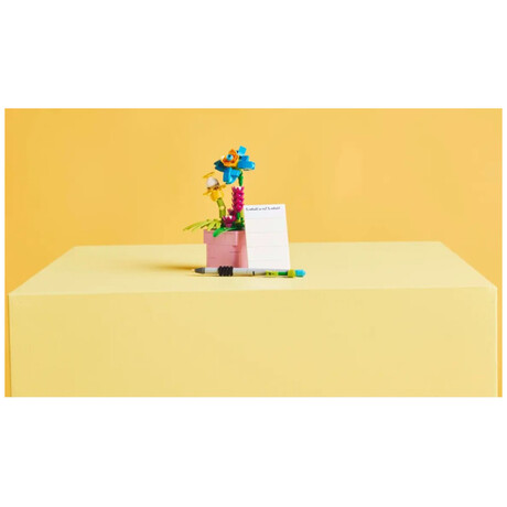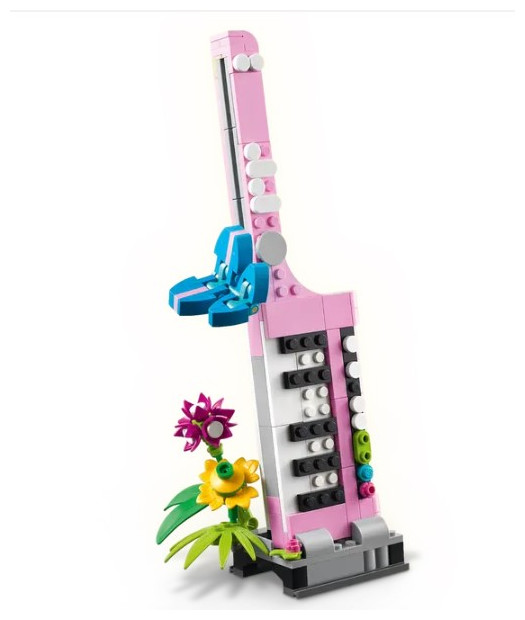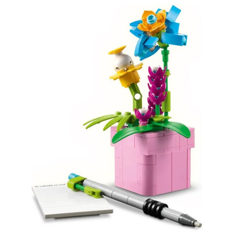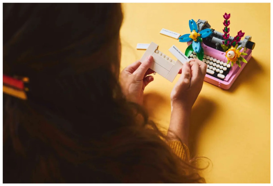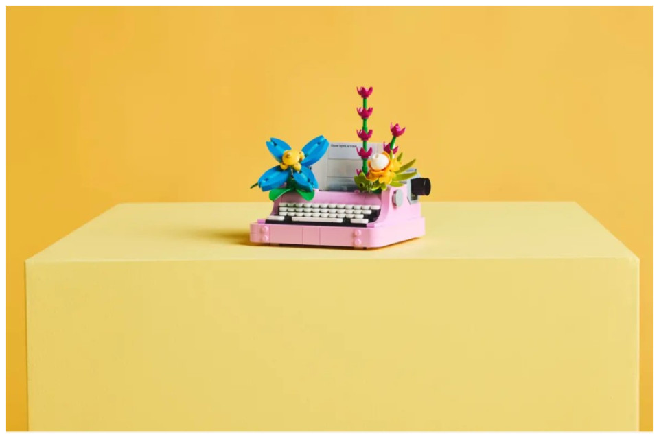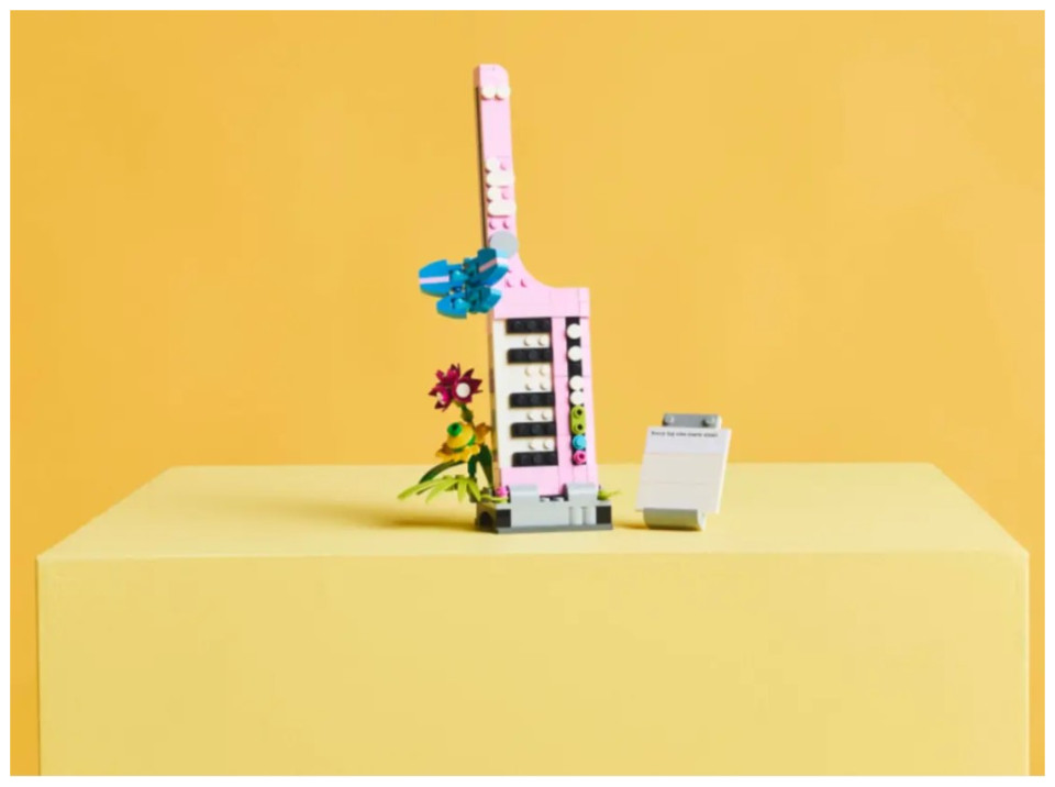 LEGO fans have a choice of 3 different flower kits to build: a Typewriter with Flowers toy; a keytar toy instrument on a stand with flowers; or a flowerpot with a pen and notebook. The rebuildable toy playset also comes with 3 stickers featuring thoughtful phrases, which kids can use to decorate the brick-built models.