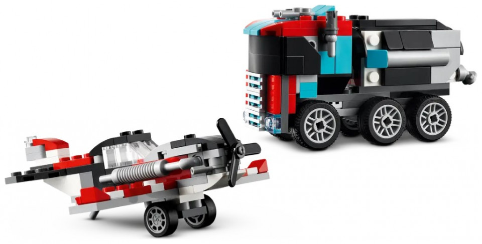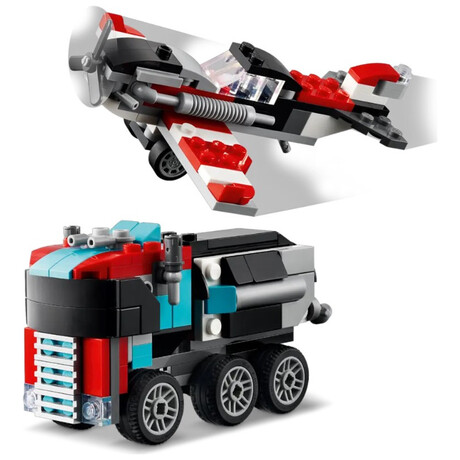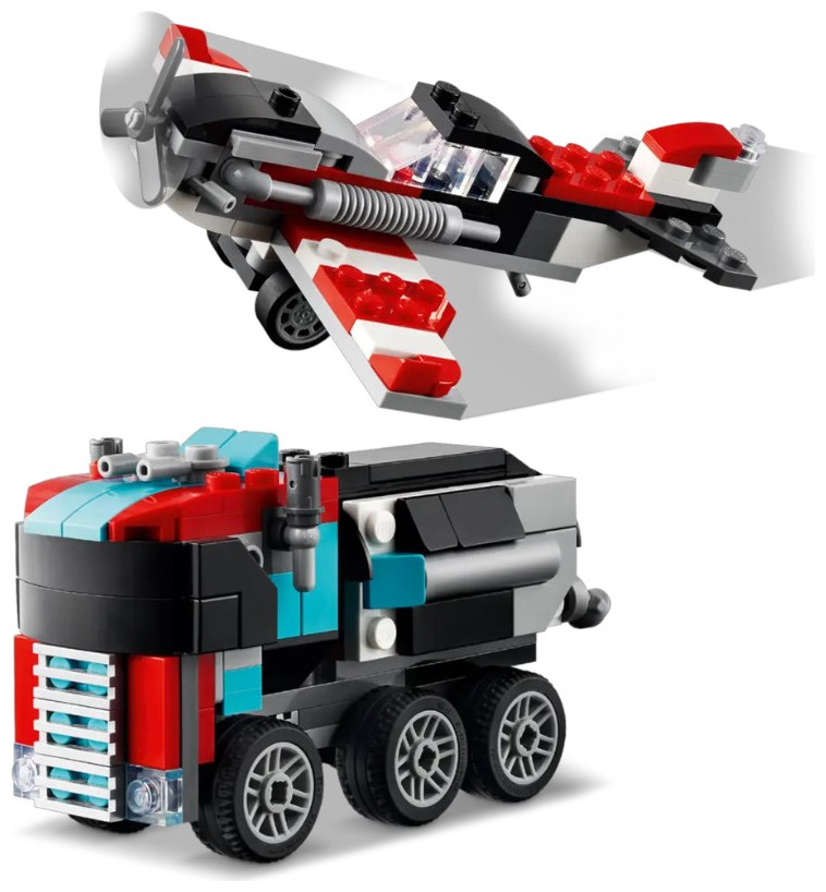 Kids can build 3 different vehicle toy sets containing 2 separate vehicles with this LEGO Creator 3in1 toy. They have the chance to build the Flatbed Truck with Helicopter, rebuild it into a propeller plane toy and fuel truck with moving wheels, make a hot rod and SUV toy car set for races, or use the bricks to create their own vehicles.